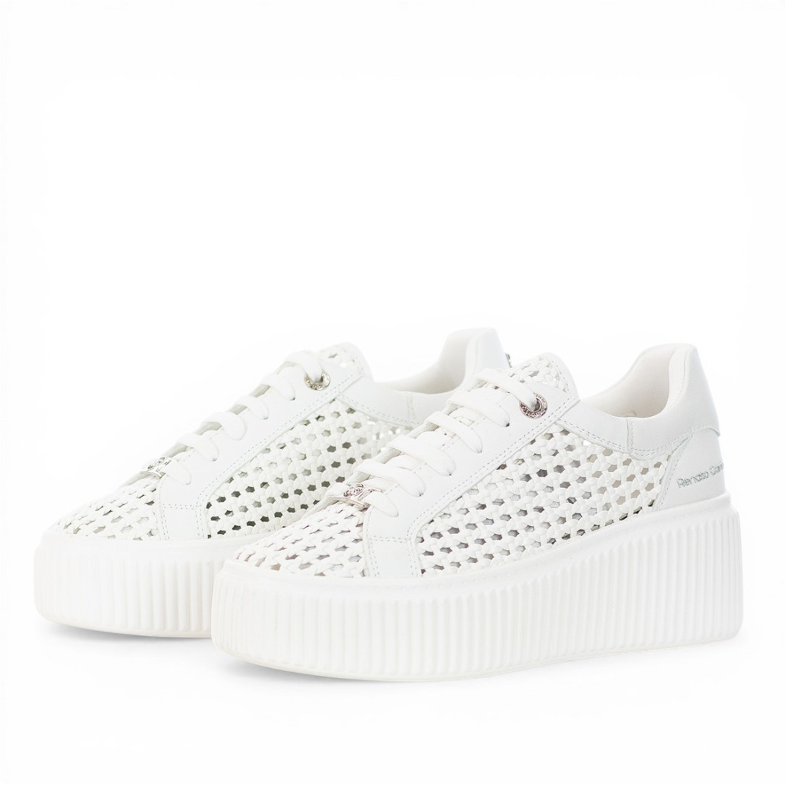 Baskets RENATO GARINI en simili-cuir blanc tressé, enrichies d'empiècements ton sur ton et du logo apposé sur le côté et à l'arrière. Ligne moderne et épurée, parfaite pour un look décontracté et soigné. Semelle en caoutchouc de 60 mm de haut qui garantit confort et élan à chaque pas.