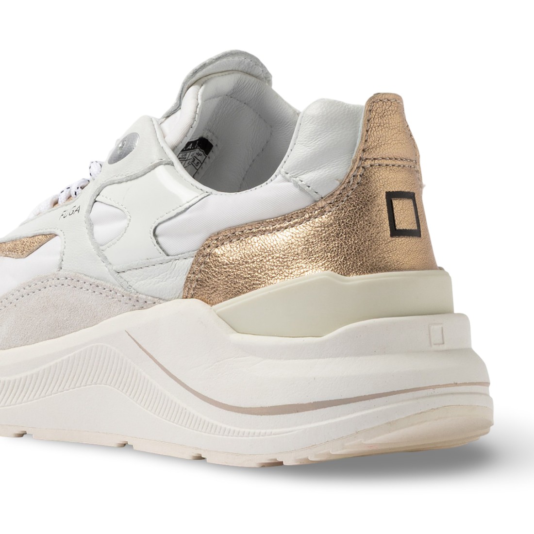 Baskets D.A.T.E. en nylon blanc avec empiècements en daim ton sur ton et cuir laminé platine. Détails en cuir brillant blanc et garniture laminée. Logo et inscription en relief sur la languette, nom FUGA sur le côté. Double lacet et talon arrière en cuir assorti. Doublure en cuir et coton éponge pour un confort optimal. Semelle en caoutchouc Blowtech légère et durable.Notre service client est disponible du lundi au samedi de 10h00 à 19h30