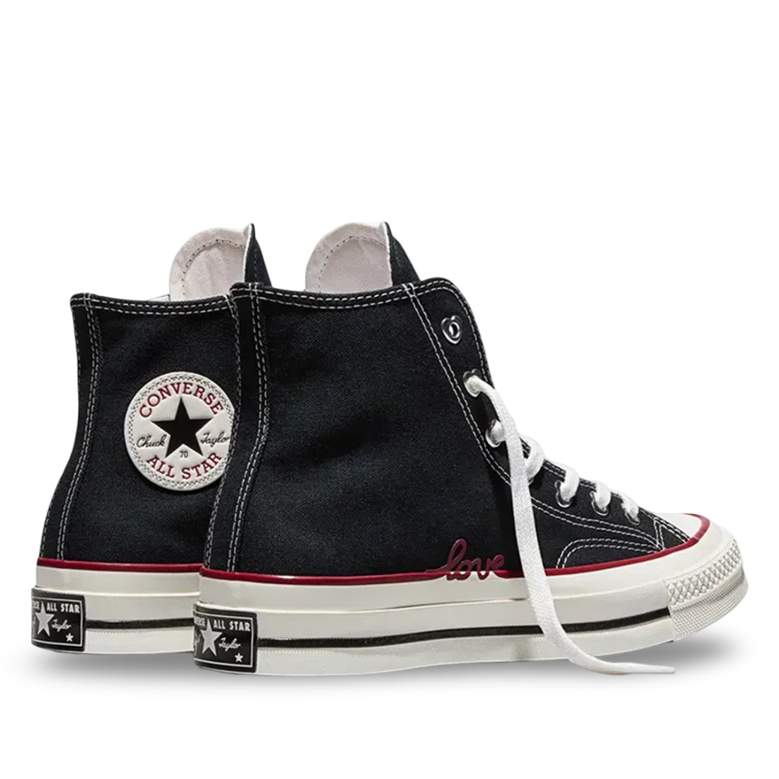 La Converse Chuck 70 Valentine's Day en toile noire célèbre l'amour avec des détails exclusifs et sophistiqués. Le logo classique Chuck Taylor All Star se détache sur le côté, tandis que la languette et les œillets en forme de cœur ajoutent une touche romantique. L'inscription Love est brodée sur le côté et intégrée à la semelle en caoutchouc, pour un style iconique réinterprété avec personnalité.