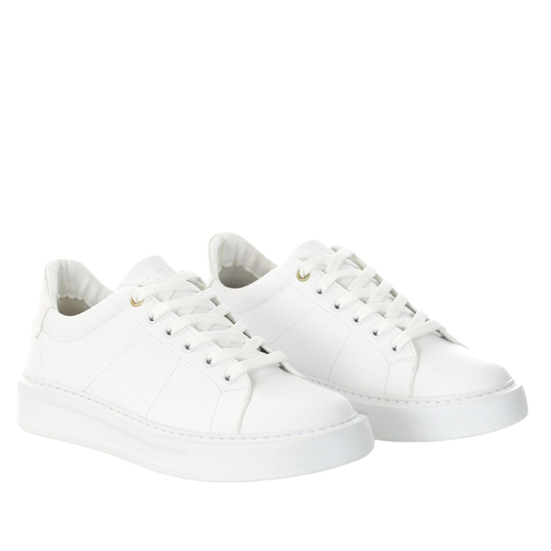 BY.ERN. - Baskets en cuir blanc avec empiècement arrière en daim bleu. Logo "By.Ern." sur la languette et à l'arrière. Semelle en caoutchouc. Art : MARSIGLIA-WHITE