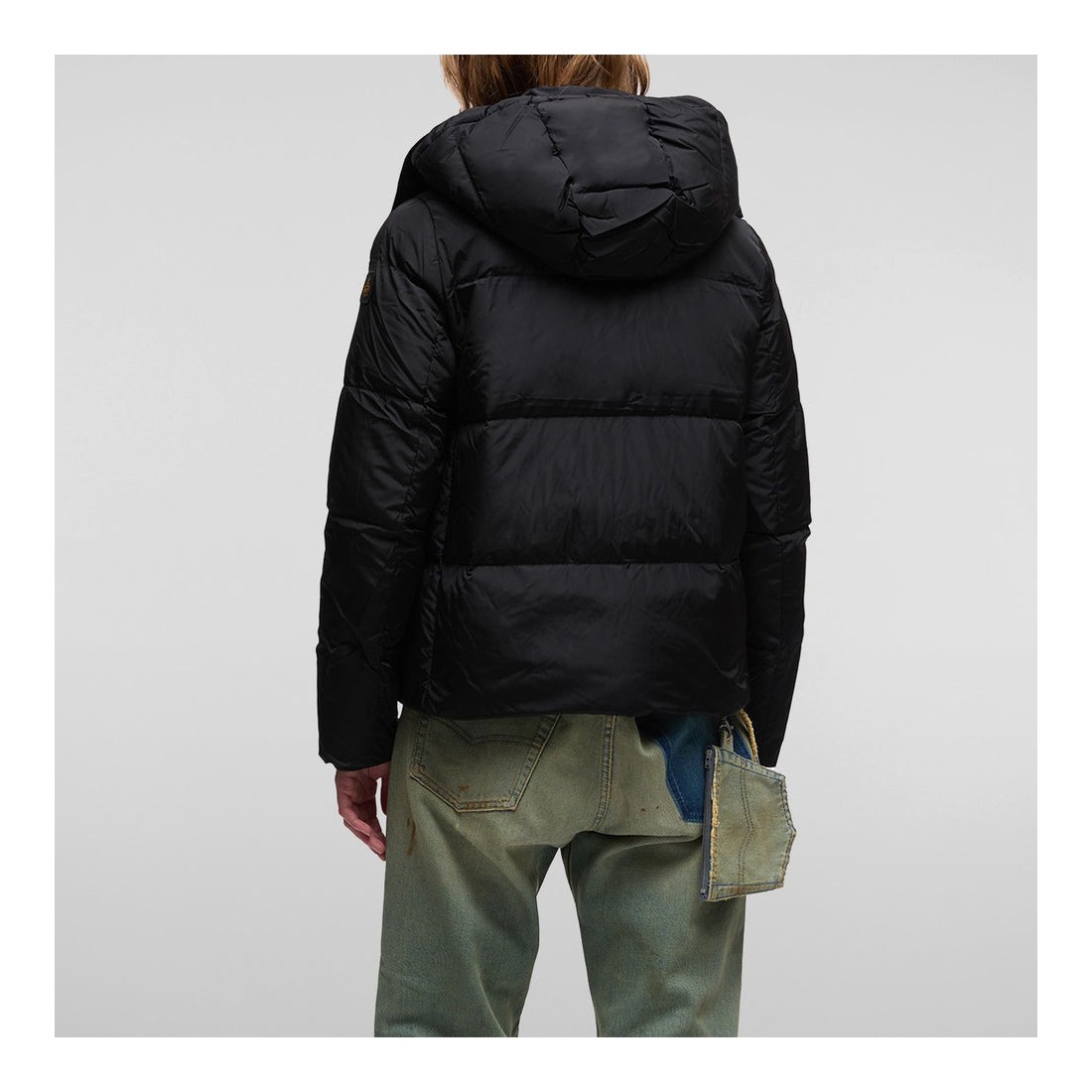Doudoune d'hiver pour femme au design moderne et légèrement surdimensionné, idéale pour un look contemporain et confortable. Le rembourrage en duvet 90-10 assure chaleur et douceur même pendant les jours les plus froids. Réalisée en nylon satiné, elle offre une élégance raffinée et une touche lumineuse. Le col montant et la capuche amovible sont pratiques et polyvalents, parfaits pour toutes les occasions hivernales.