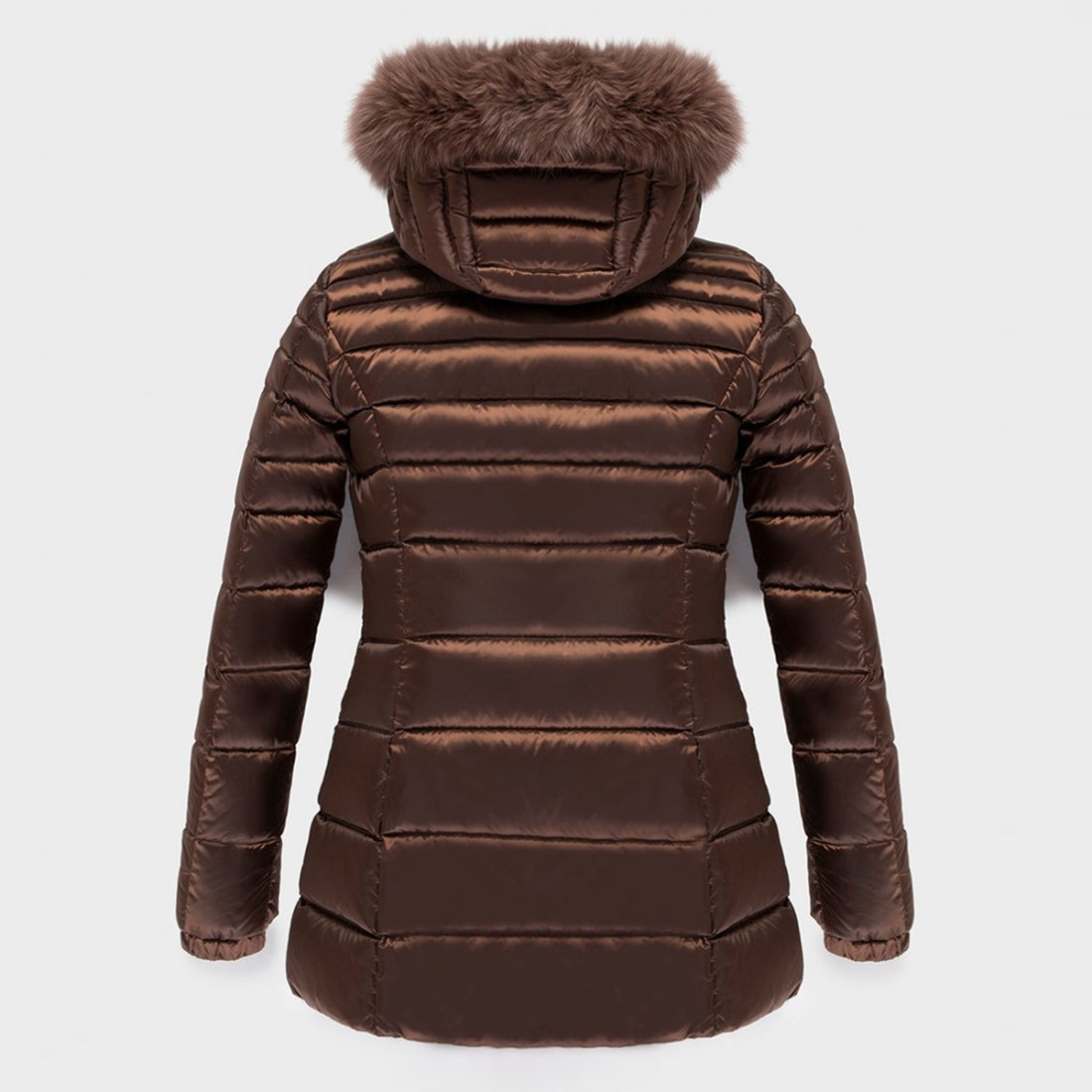 Doudoune d'hiver pour femme de longueur ¾ avec fourrure, au design élégant et féminin. Réalisée en nylon satiné d'aspect moderne, elle offre chaleur et confort grâce à son garnissage à injection directe de 100% de duvet 90-10. Douce, pratique et légère, elle est parfaite pour affronter l'hiver avec style. Un vêtement polyvalent et intemporel, indispensable à votre garde-robe de saison.