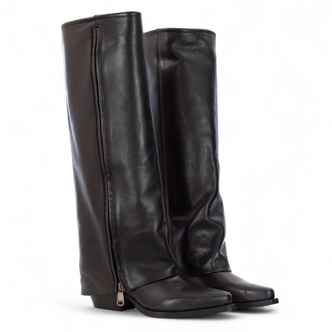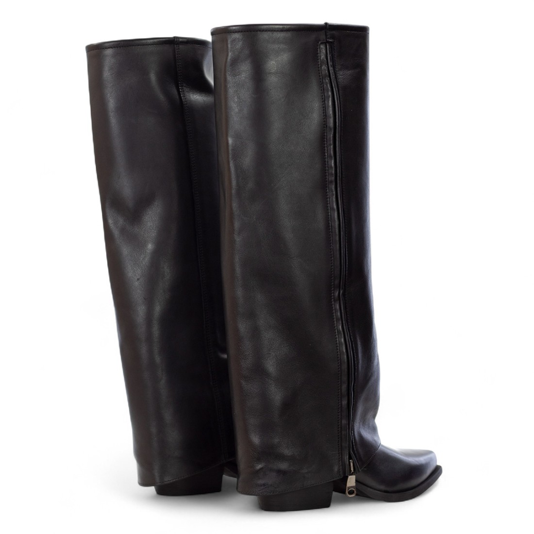 Botte Metisse en cuir noir souple avec un design moderne, un talon de 60 mm et une fermeture éclair latérale pratique. La doublure et la semelle intérieure en cuir et en similicuir offrent confort et respirabilité, tandis que la semelle en caoutchouc garantit la stabilité. Élégante et polyvalente, elle est parfaite pour compléter un look chic en toute occasion.