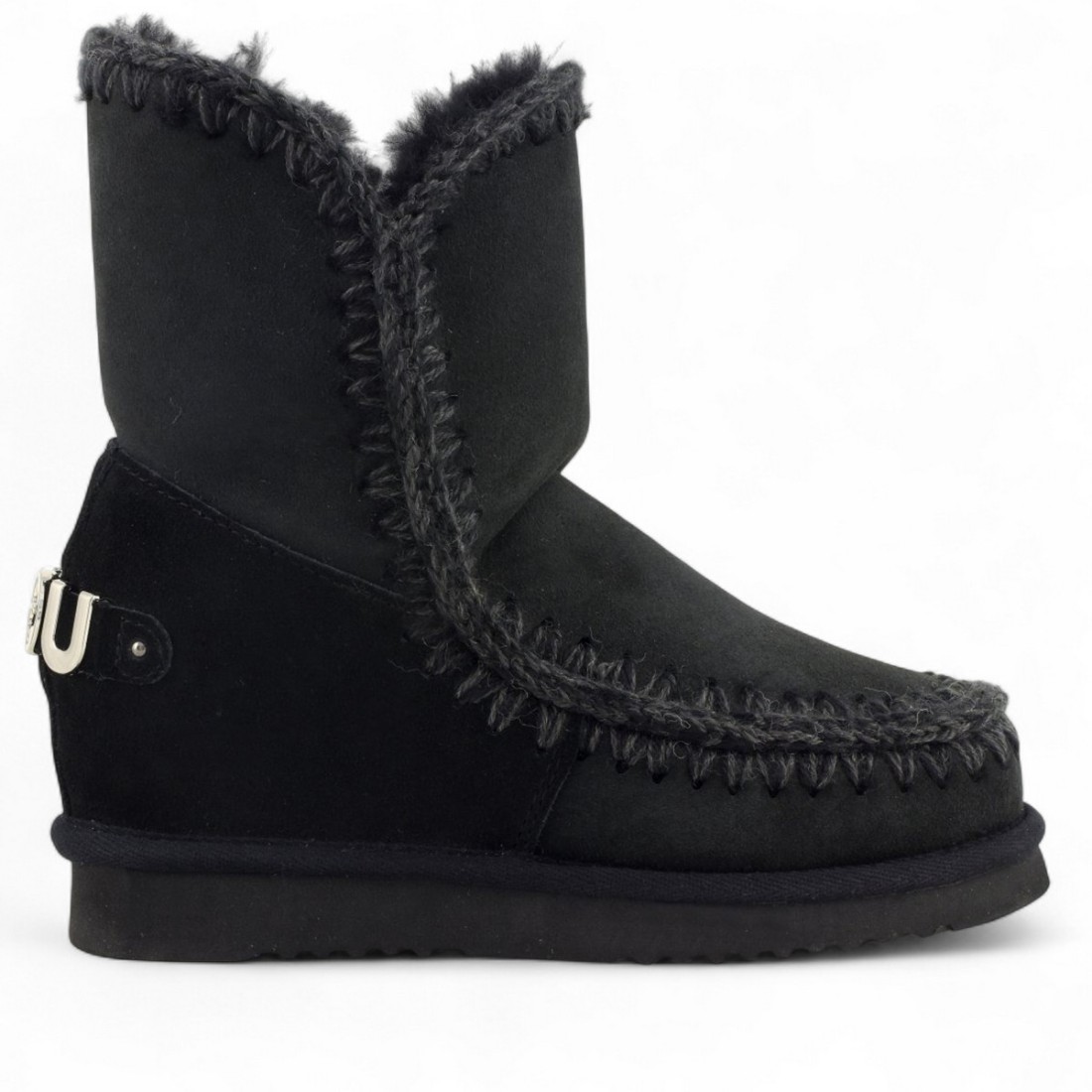Bottines MOU Eskimo Inner Wedge Short Big Metal Logo en daim noir avec surpiqûres au crochet et logo en métal à l'arrière. La doublure douce en peau de mouton double face assure confort et chaleur, tandis que la semelle intérieure compensée de 50 mm et la semelle en caoutchouc assurent soutien et stabilité. Parfaites pour un style raffiné et polyvalent lors des journées froides.