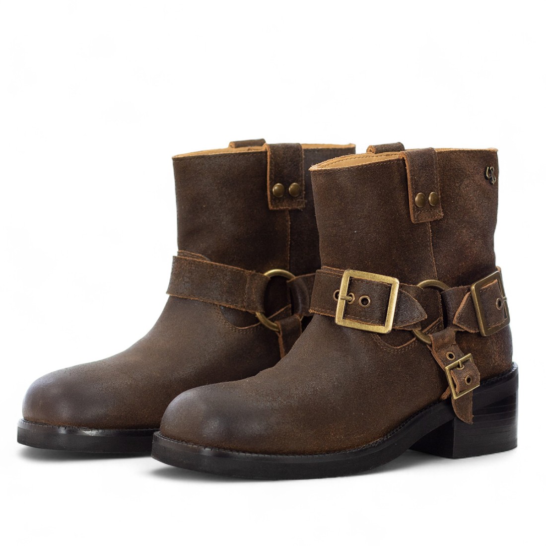 Bottines Coral Blue en daim marron souple à effet vintage, avec talon de 55 mm et brides latérales. Doublure et semelle intérieure en cuir pour un maximum de confort et de respirabilité. La semelle en caoutchouc garantit la stabilité, ce qui la rend idéale pour compléter un look chic et sophistiqué en toute occasion.