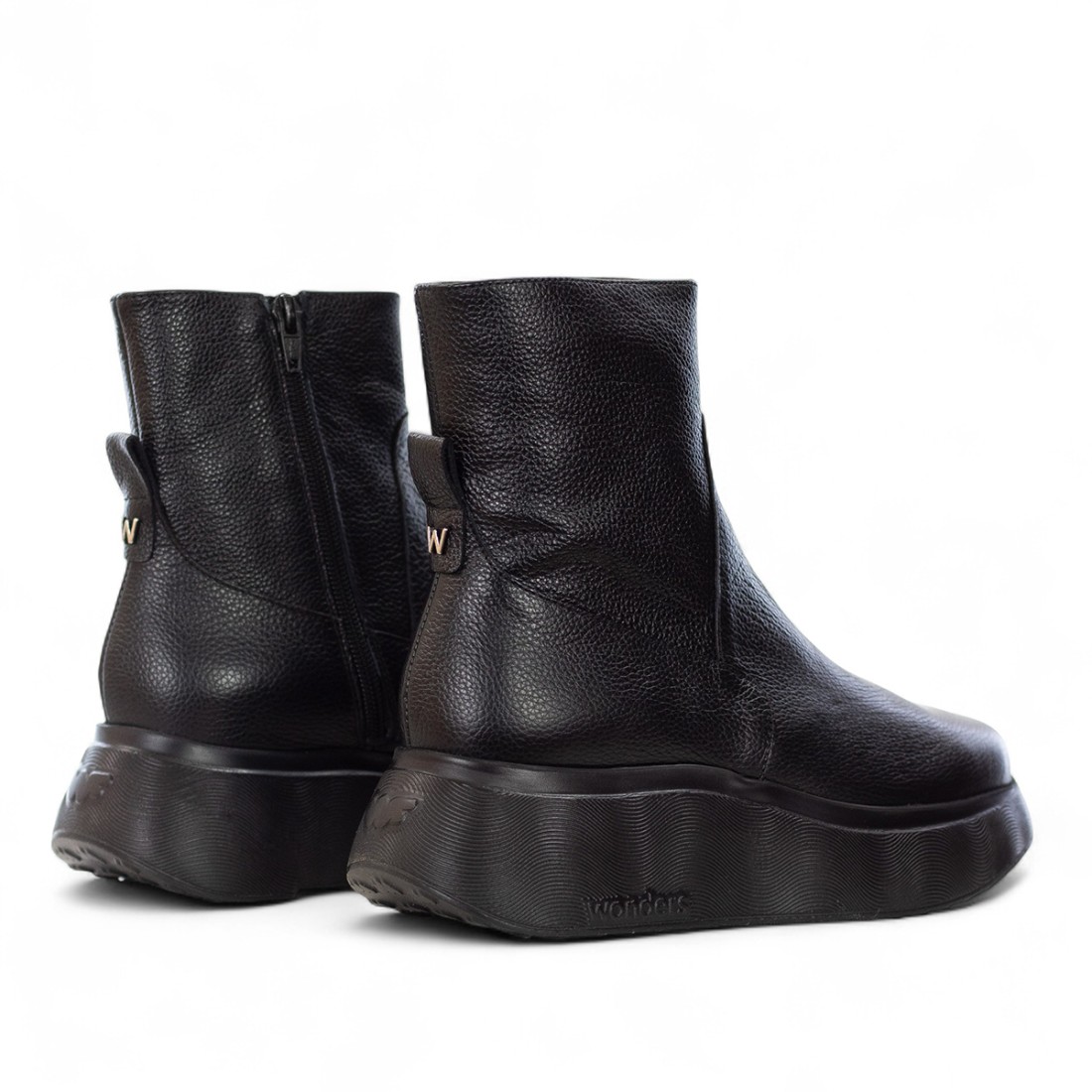 Bottines Wonders en cuir noir souple, parfaites pour un style élégant et confortable. La hauteur de la semelle d'environ 50 mm met en valeur la silhouette sans sacrifier le confort. Elle est dotée d'une fermeture éclair latérale pratique, d'une doublure et d'une semelle intérieure en cuir pour un confort durable. Logo gaufré distinctif à l'arrière et semelle en caoutchouc antidérapante.