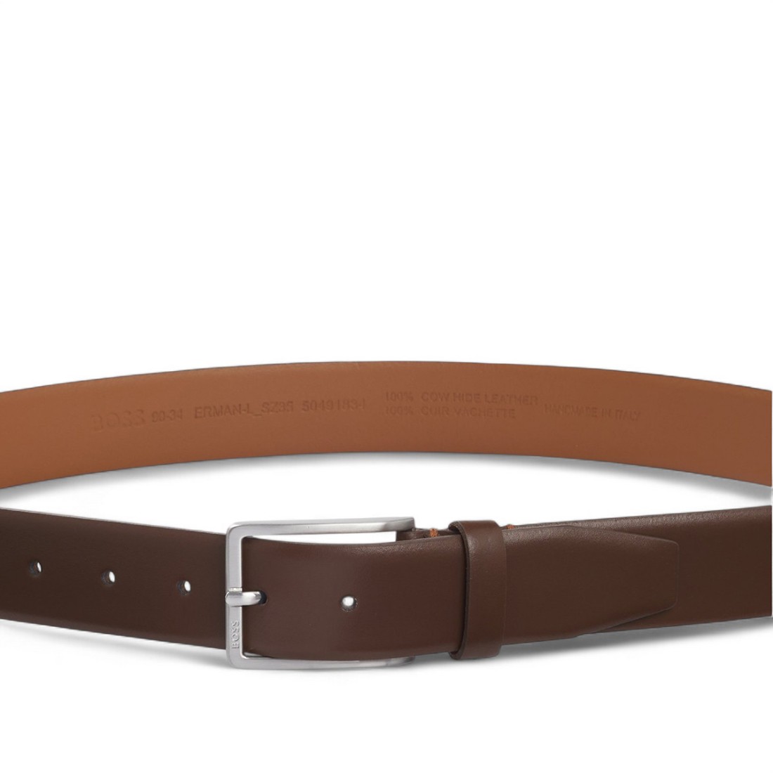 Ceinture BOSS pour homme en cuir italien fin avec boucle brossée et logo gravé. D'une largeur de 3,5 cm, elle ajoute une touche d'élégance à tous les looks. Elle est ornée de détails métalliques argentés et d'un logo gravé à l'extérieur. Pour un ajustement optimal, choisissez une taille au-dessus de votre tour de taille. Cuir provenant de tanneries certifiées et composé d'au moins 80 % de matériaux de haute qualité.