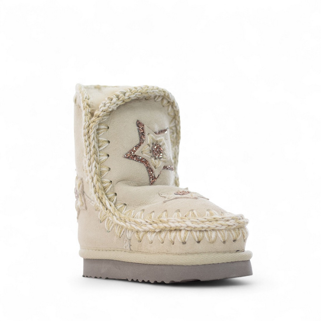 Bottine MOU pour fille en daim couleur craie avec surpiqûres au crochet et broderie d'étoiles avec strass étincelants. La doublure en peau de mouton douce des deux côtés assure confort et chaleur, tandis que l'écusson du logo Mou à l'arrière ajoute une touche distinctive. Semelle en caoutchouc durable pour un look élégant et pratique, idéal pour les jours les plus froids.Notre service client est disponible du lundi au samedi de 10h00 à 19h30