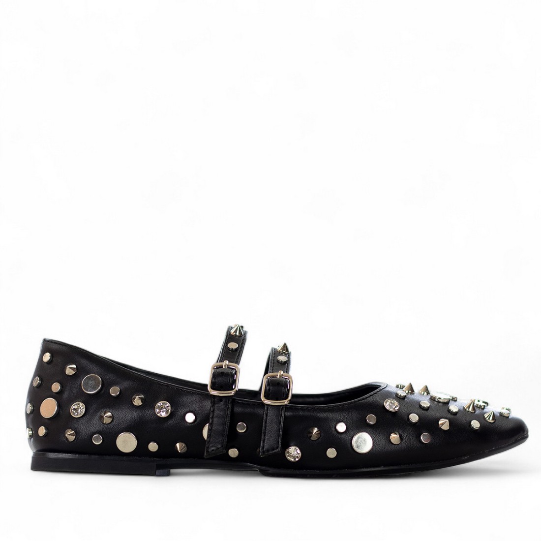 Ballerine EXÉ en simili-cuir noir ornée de clous sur toute sa surface et d'une double bride réglable avec boucle. Confort et stabilité grâce au talon bas de 10 mm et à la semelle en caoutchouc. Doublure et semelle intérieure en faux cuir pour une touche élégante et polyvalente, parfaite pour compléter chaque look avec style.Notre service client est disponible du lundi au samedi de 10h00 à 19h30