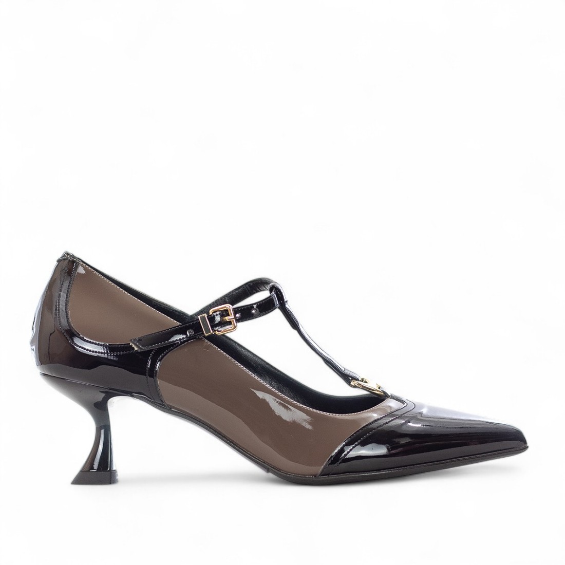 Décolleté Albano en cuir verni taupe noir, parfait pour un look élégant et sophistiqué. Le talon d'environ 55 mm offre confort et style, tandis que le design raffiné avec bride avant ajoute une touche d'originalité. La doublure et la semelle intérieure en cuir assurent un port confortable, et la semelle en caoutchouc garantit stabilité et durabilité. Des chaussures idéales pour se démarquer avec classe en toute occasion.Notre service client est disponible du lundi au samedi de 10h00 à 19h30
