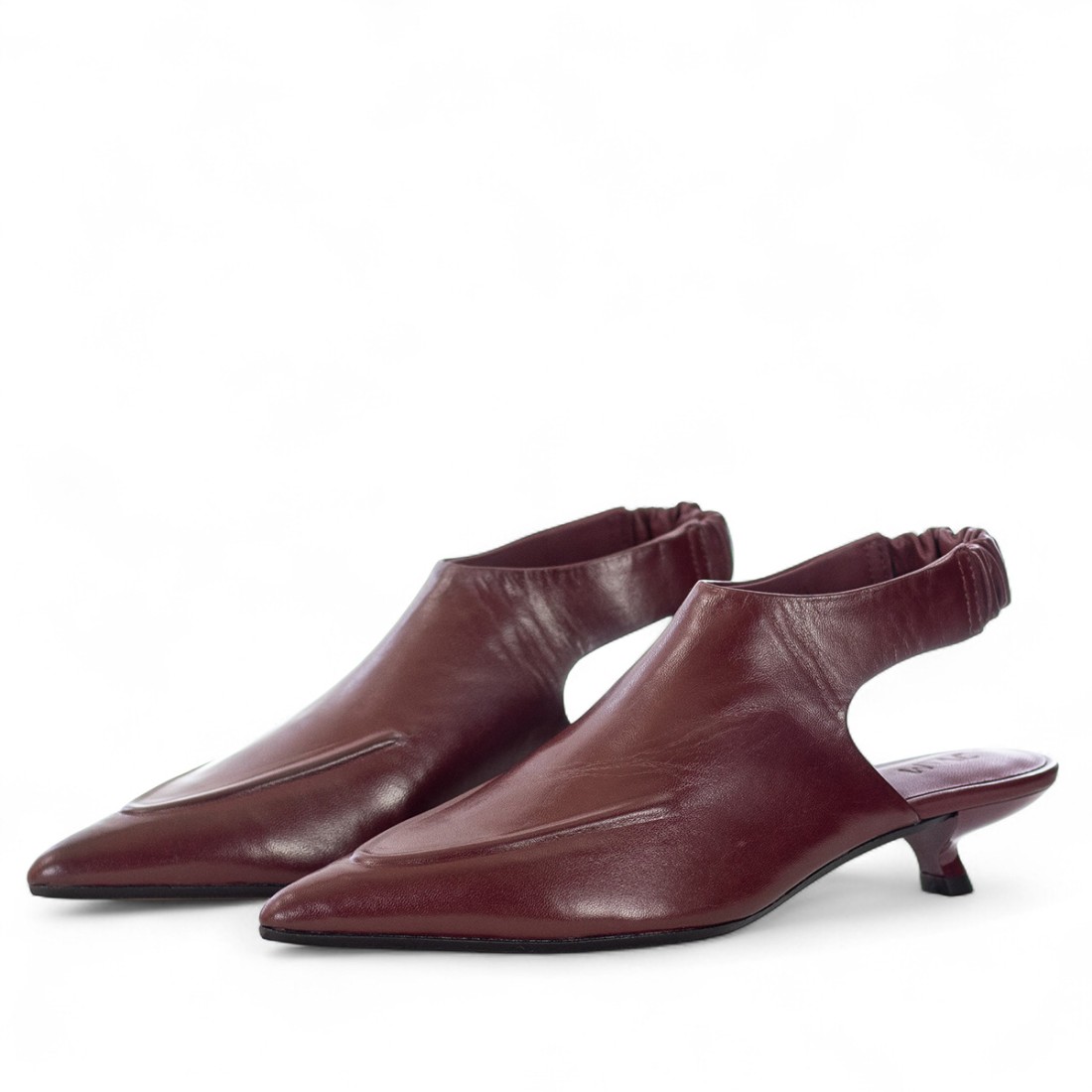 Escarpin en cuir souple bordeaux avec talon de 5 cm, ouvert à l'arrière. La doublure et la semelle intérieure en cuir offrent confort et respirabilité, tandis que la semelle en caoutchouc avec insert en cuir garantit la stabilité. Élégant et polyvalent, il est idéal pour compléter un look chic en toute occasion, alliant style et praticité sans sacrifier le confort.