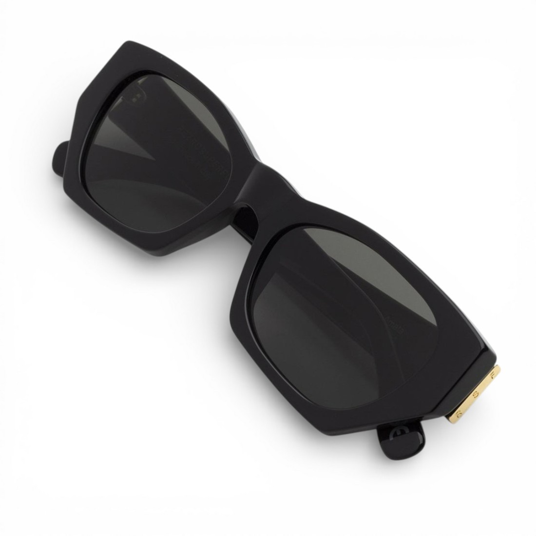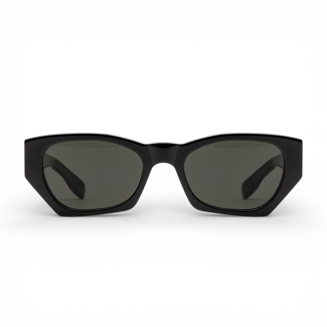 Lunettes de soleil Amata en acétate noir brillant, avec des verres noirs et une monture géométrique audacieuse inspirée du style iconique des années 1960. Les lignes droites, les montures légèrement inclinées et le pont de nez audacieux donnent de la personnalité et de la structure au visage, tandis que les branches robustes assurent confort et stabilité. Un modèle distinctif, parfait pour ceux qui recherchent un accessoire à la fois vintage et contemporain.
