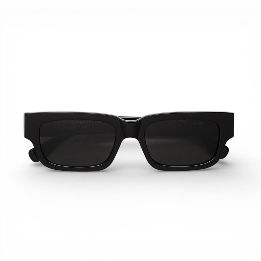 RETROSUPERFUTURE Lunettes de soleil Roma Black, fabriquées en nylon acétate noir épuré, avec des verres assortis dans le même ton. Design contemporain et raffiné, parfait pour un style urbain et distinctif. Étui semi-rigide en caoutchouc noir pour la protection et la praticité.