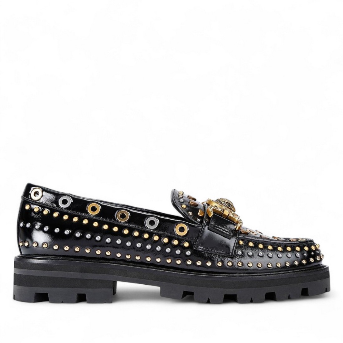 Mocassins Mansion Stud en cuir verni noir avec clous en laiton vieilli et en argent sur le dessus. Le design exclusif est enrichi d'une chaîne de style pince en laiton vieilli avec une tête d'aigle centrale pour un look élégant et audacieux. Des mocassins idéaux pour se démarquer avec caractère et style en toute occasion.Notre service client est disponible du lundi au samedi de 10h00 à 19h30