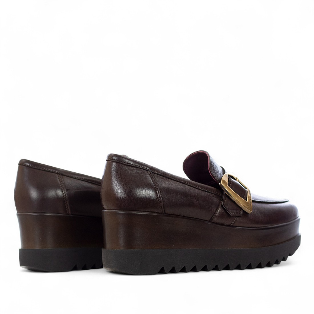 Mocassin Lorenzo Mari en cuir BRUN, élégant et original. La lanière dorée sur le devant ajoute une touche de style sophistiqué. Hauteur du bas d'environ 60 mm, semelle et doublure en cuir pour un maximum de confort, semelle en caoutchouc pour plus de résistance. Parfait pour ceux qui recherchent un look unique et à la mode sans sacrifier la qualité des matériaux.Notre service client est disponible du lundi au samedi de 10h00 à 19h30