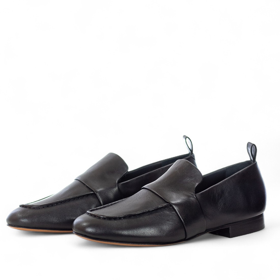 Mocassin en cuir noir souple avec un talon de 20 mm. La doublure et la semelle intérieure en cuir assurent confort et respirabilité, tandis que la semelle en caoutchouc avec insert en cuir garantit la stabilité. Élégant et polyvalent, il est parfait pour compléter un look chic en toute occasion.