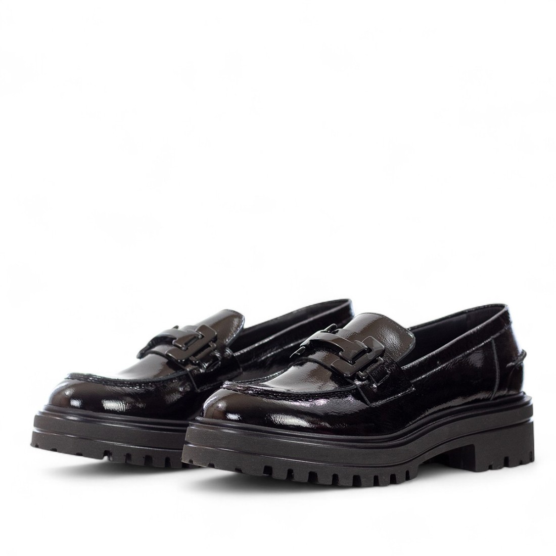 Mocassin en cuir noir à effet naplak avec talon de 40 mm. La doublure et la semelle intérieure en cuir offrent confort et commodité, tandis que la semelle en caoutchouc assure la stabilité à chaque pas. Elégant et polyvalent, il est le choix parfait pour compléter un look chic en toute occasion.