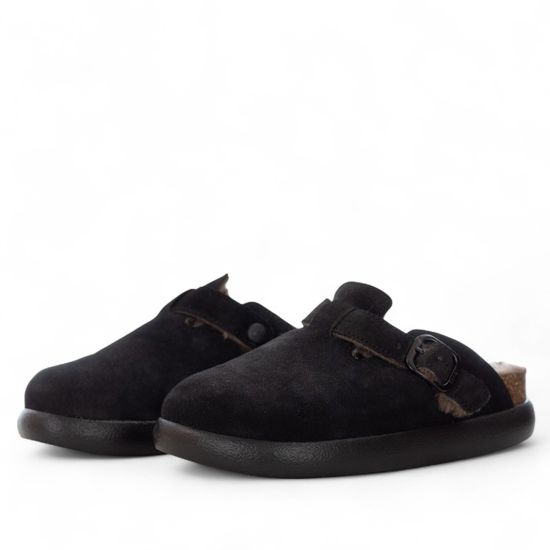 Sabot en daim souple avec fourrure noire, doublure et semelle intérieure en fourrure pour un confort unique. La semelle en caoutchouc garantit une stabilité à chaque pas, idéale pour un look chic et raffiné en toute occasion.