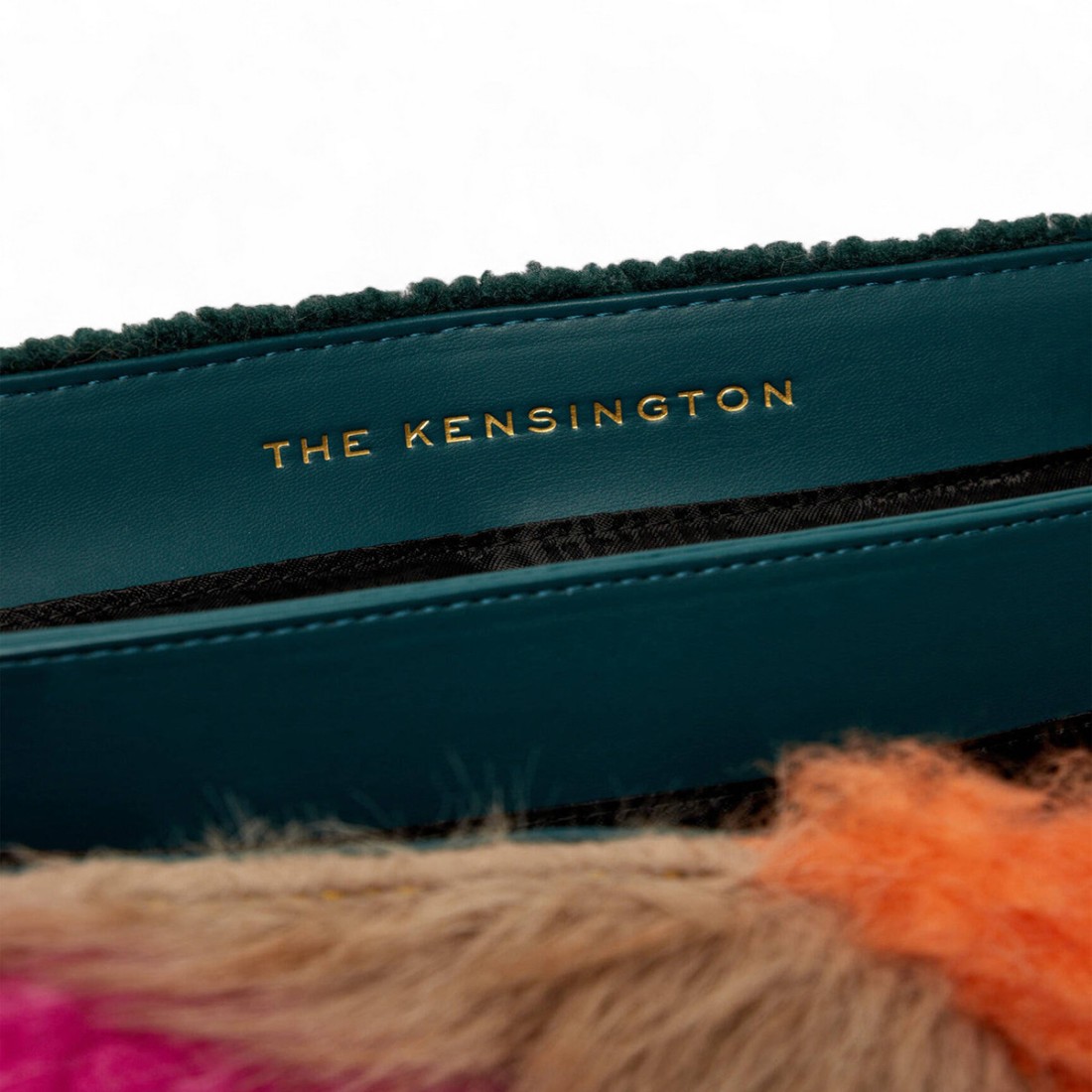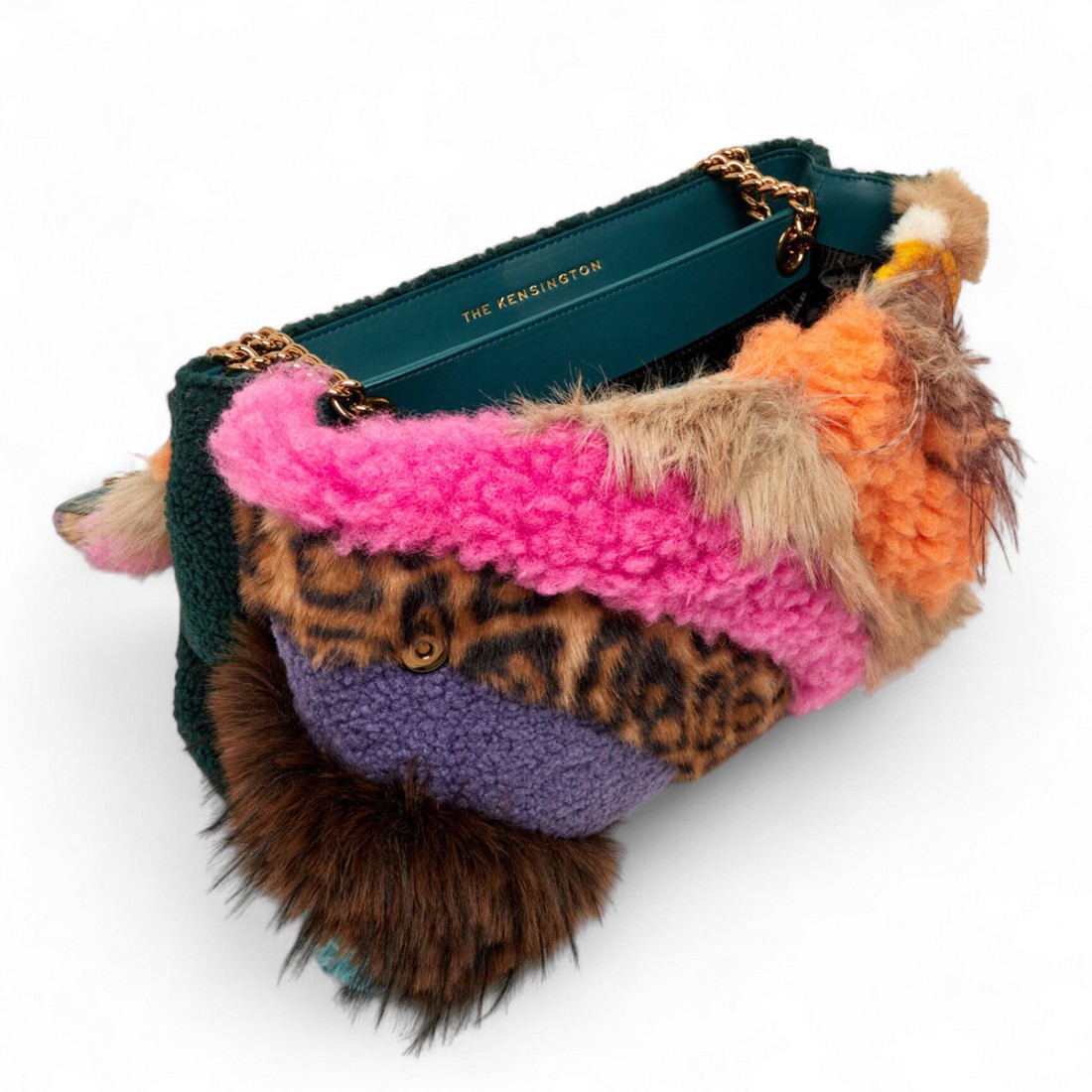 Sac à bandoulière XXL Kensington Fur en fausse fourrure multicolore avec détails à motifs, enrichi de l'emblématique tête d'aigle avec strass. Doté d'une bandoulière en chaîne, d'un double compartiment interne et d'une fermeture à rabat pratique, il allie style et fonctionnalité. Dimensions 37x25x15 cm, idéal pour celles qui recherchent un accessoire original et spacieux pour compléter chaque look avec une touche sophistiquée.
