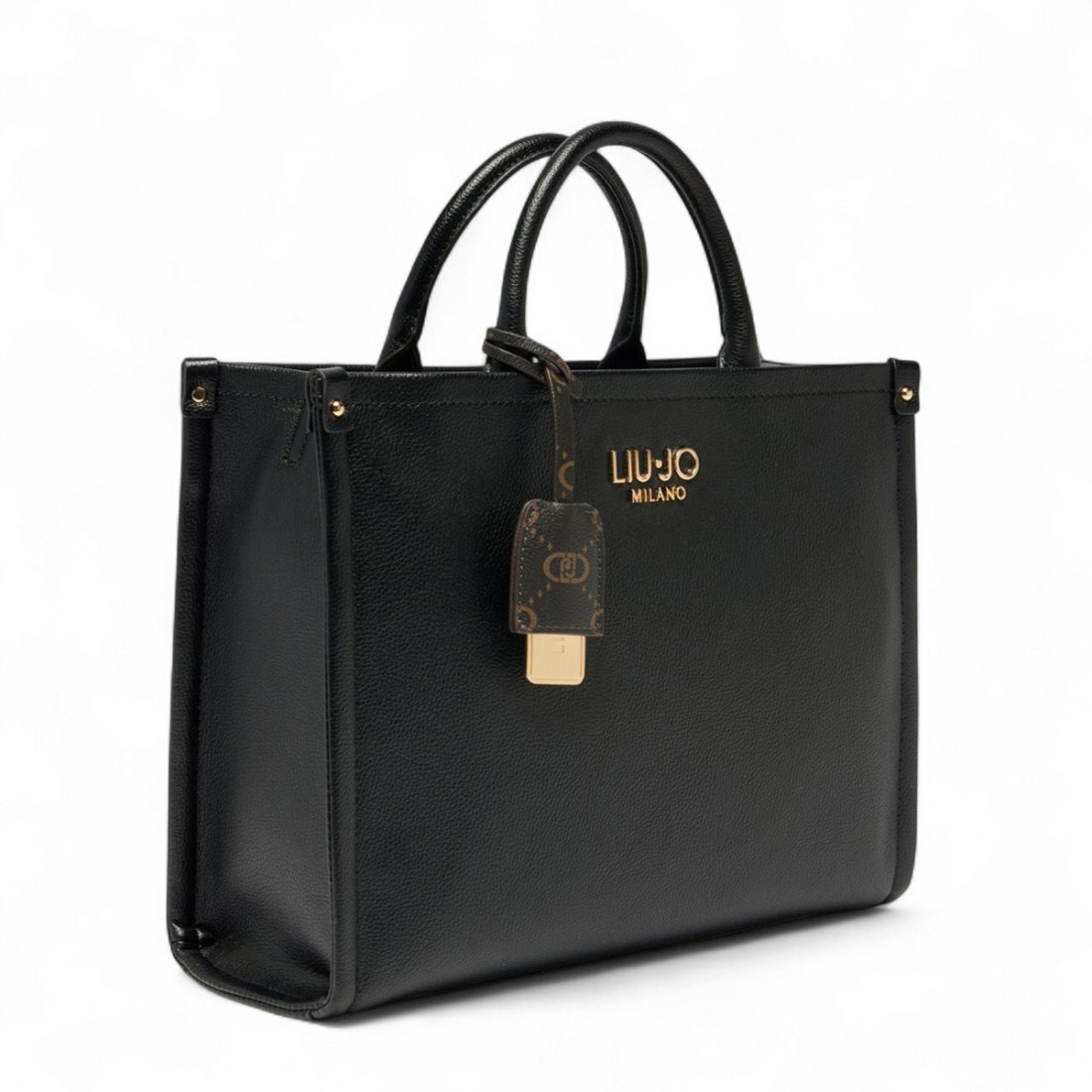 Élégant sac à provisions Liu Jo en faux cuir noir tambouriné, mesurant 34x13x27 cm. Doté de poignées confortables et d'une bandoulière réglable et amovible, il est muni d'une fermeture à glissière et d'une poche intérieure zippée. La doublure est ornée d'un logo, d'une breloque distinctive et d'un logo en métal, tandis que les pieds en métal garantissent stabilité et protection.