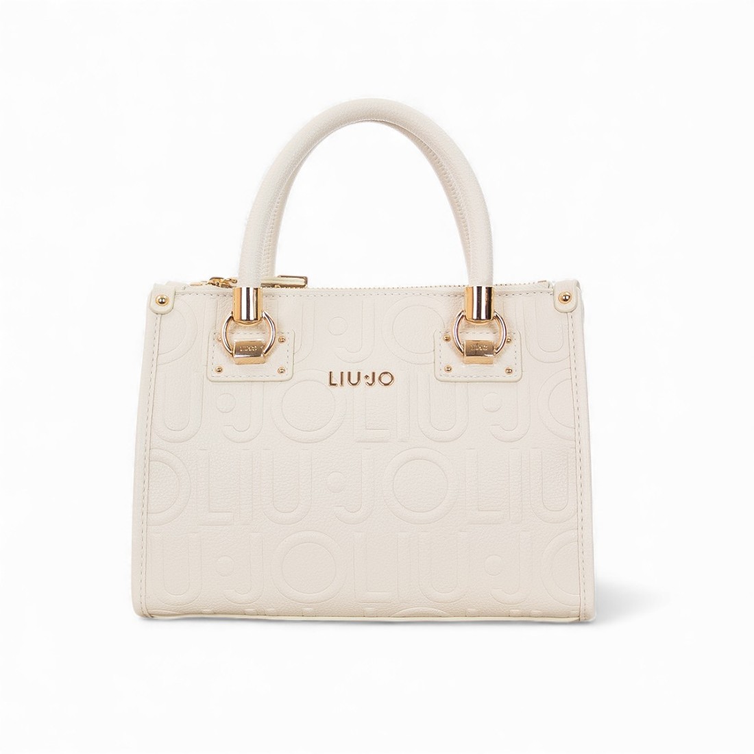 Petit sac à main Liu Jo en blanc, réalisé en similicuir souple. Compact mais fonctionnel, il offre un compartiment principal avec fermeture à clip magnétique, trois poches zippées et une poche plate. Mesurant 24 x 20 x 10 cm, avec des poignées de 8 cm de haut et une sangle réglable jusqu'à 112 cm, il est parfait pour un usage quotidien sans sacrifier le style.