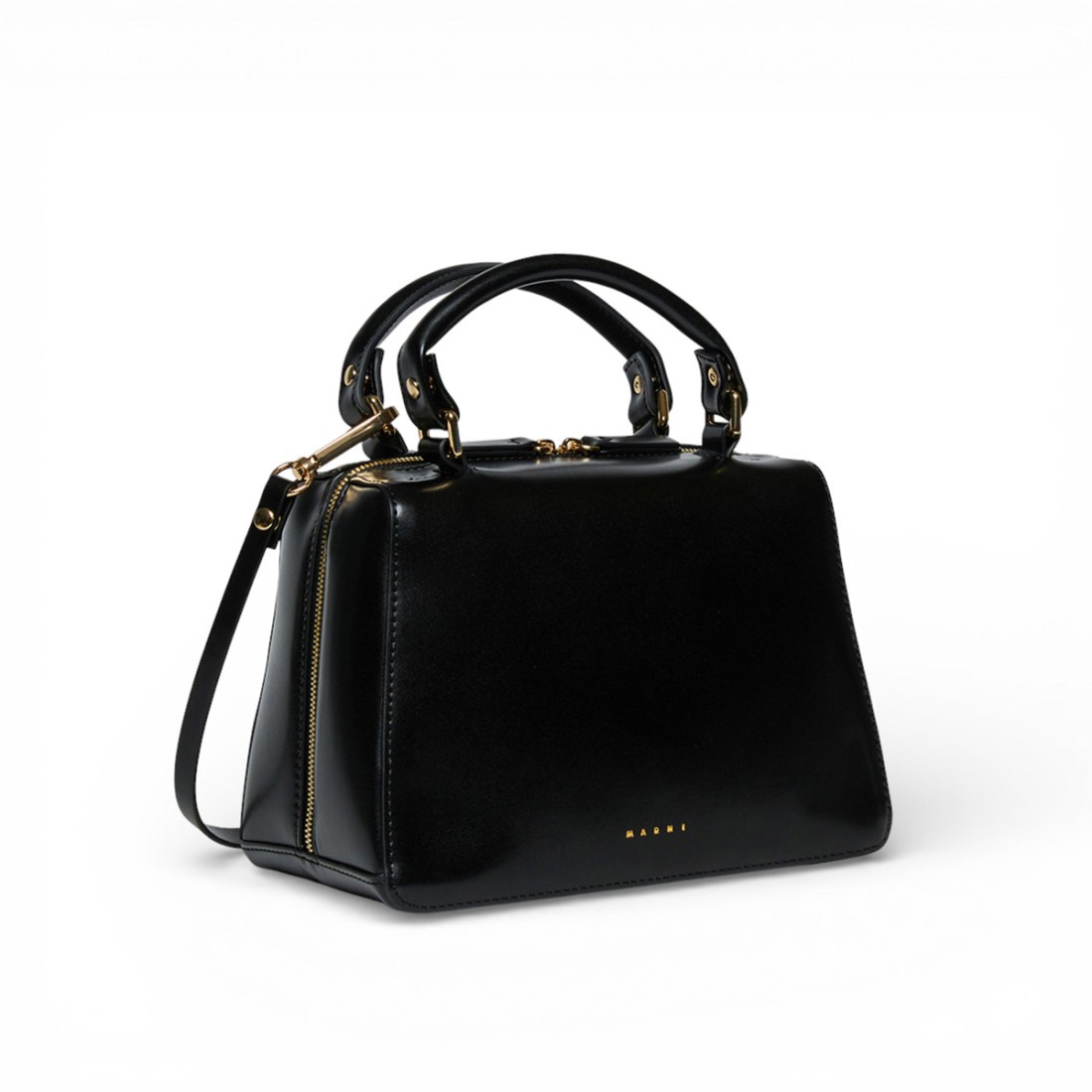 Sac d'école MARNI en faux cuir enduit noir, avec logo en lettres contrastantes sur le devant. Compact mais spacieux, il est conçu pour un usage quotidien grâce à ses poches intérieures pratiques et à sa fermeture à glissière. Doté d'une bandoulière réglable et amovible, il se porte à la main ou à l'épaule.