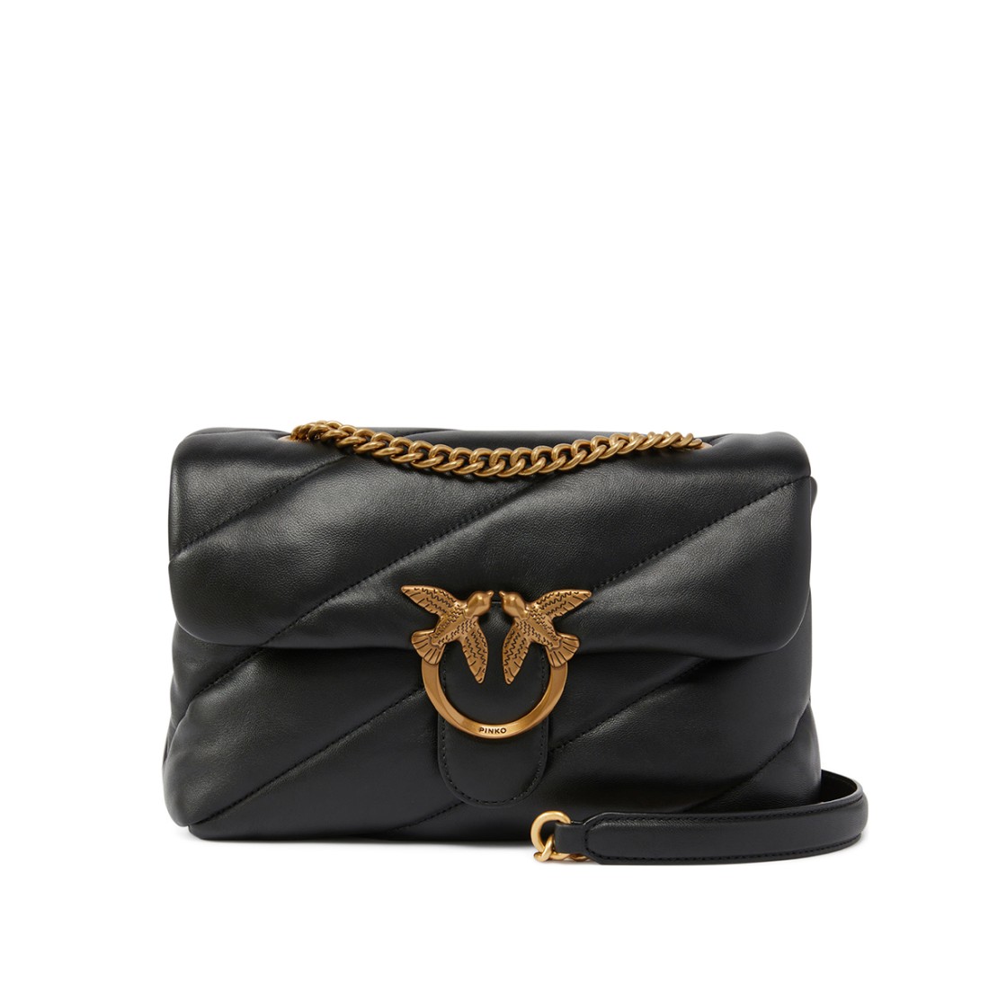 Pinko Classic Love Bag Sac à bandoulière en cuir nappa noir souple, rehaussé d'un matelassage oblique maxi. Fermeture avec la boucle métallique emblématique Love Birds Diamond Cut. Intérieur doublé de microfibre effet daim avec compartiment central zippé et poche murale. Bandoulière ronde en chaîne métallique et cuir nappa. Dimensions : 26 x 17 x 11 cm.