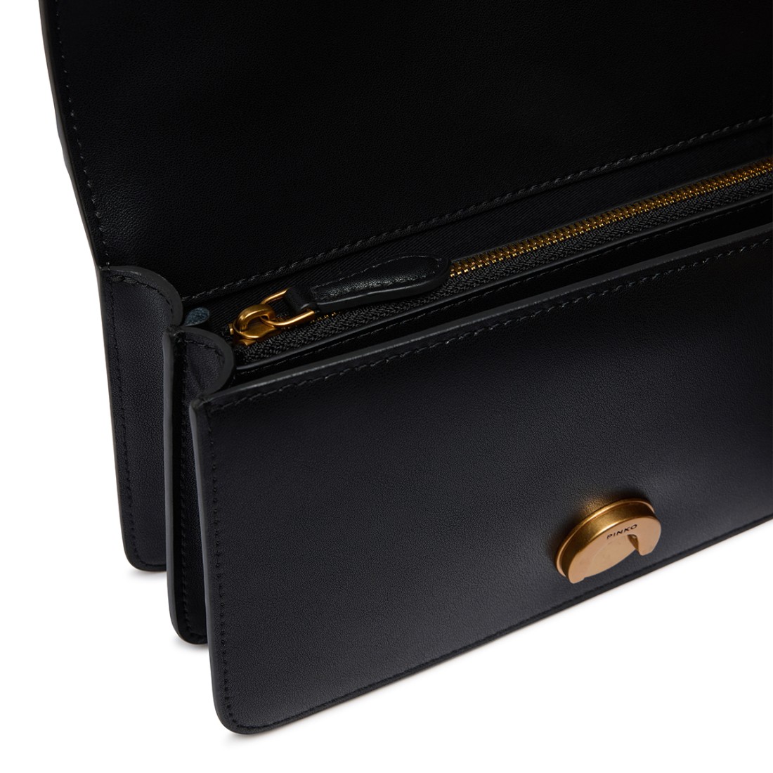Découvrez le Pinko Love Bag One, un petit sac à bandoulière en cuir noir soyeux. Polyvalent et pratique, il est doté d'une bandoulière réglable et amovible en cuir et chaîne, d'une fermeture à bouton magnétique, d'une boucle à logo Love Birds Diamond Cut et de détails en métal doré antique. L'intérieur est doublé de coton et comporte une poche zippée pour les objets essentiels. Dimensions : 21x13x7 cm.