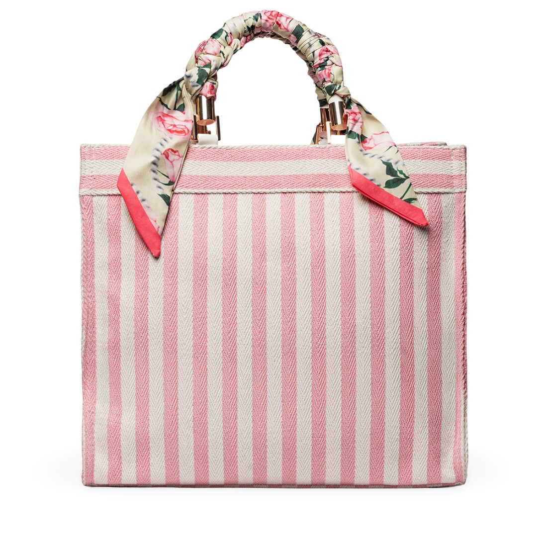Découvrez le sac à main SECRET PON PON Saint Tropez M en toile beige à délicates rayures roses, orné d'un logo et d'une décoration brodée sur le devant. Il est doté d'une double anse foulard, d'une bandoulière réglable et amovible, d'une fermeture zippée et d'un intérieur spacieux. Parfait pour compléter votre look avec style. Dimensions : 35 x 31 x 14 cm.