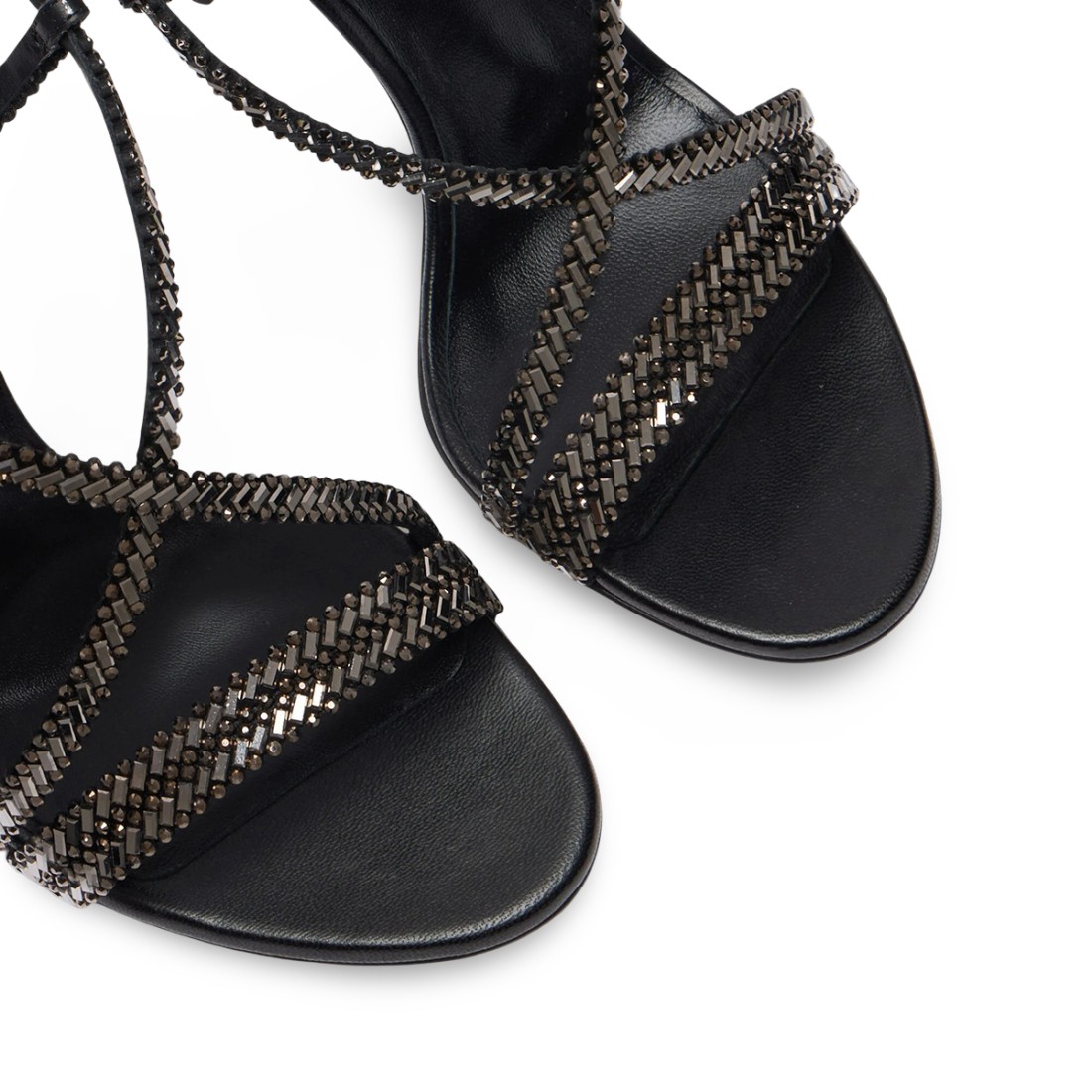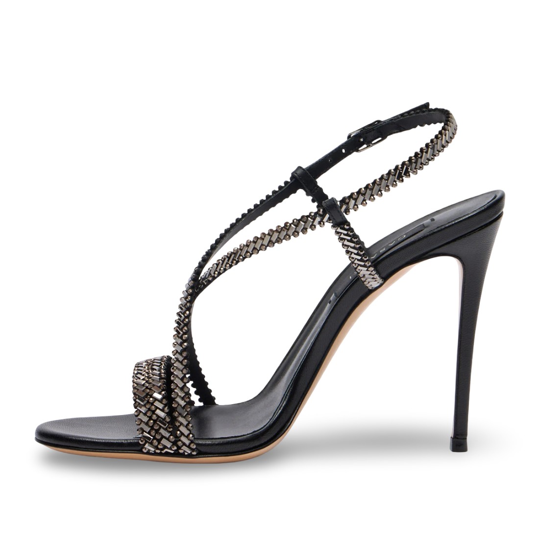 Sandale Josephine en cuir noir, avec un talon aiguille de 10 cm, d'une élégance audacieuse et lumineuse. De fines lanières croisées et ornées de micro-cristaux définissent une silhouette sensuelle et décisive, tandis que la bride à la cheville assure la stabilité et un ajustement parfait. Un modèle de caractère, idéal pour ajouter du glamour aux looks les plus minimes, parfait pour les cérémonies et les occasions spéciales.