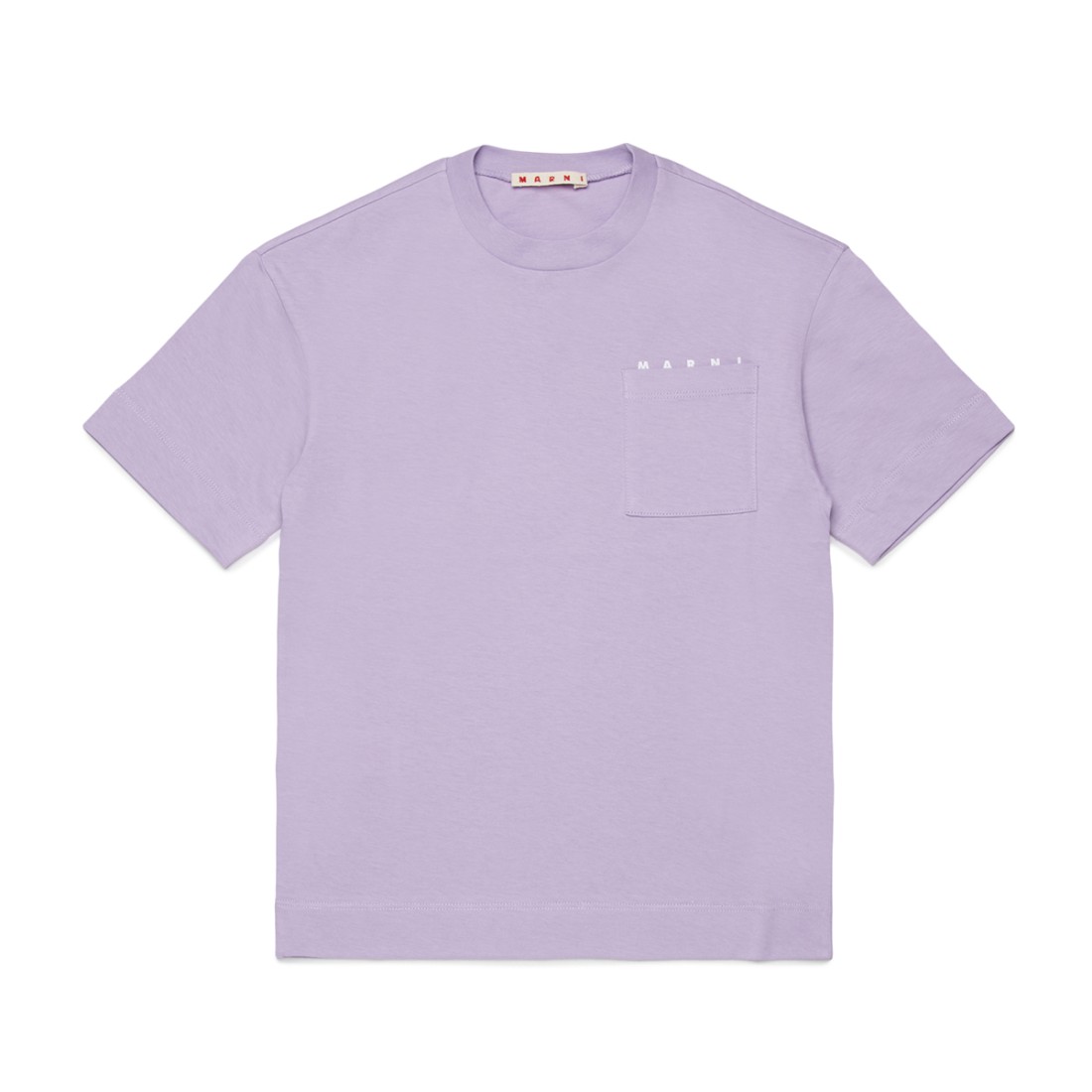 T-shirt MARNI en jersey de coton violet, un vêtement essentiel qui allie confort et style pour une utilisation quotidienne. Le modèle présente un col ras du cou, des manches courtes et une poche poitrine pratique avec un détail en forme de cœur. Le logo en lettres contrastées au-dessus de la poche ajoute une touche distinctive. 100% coton, coupe régulière