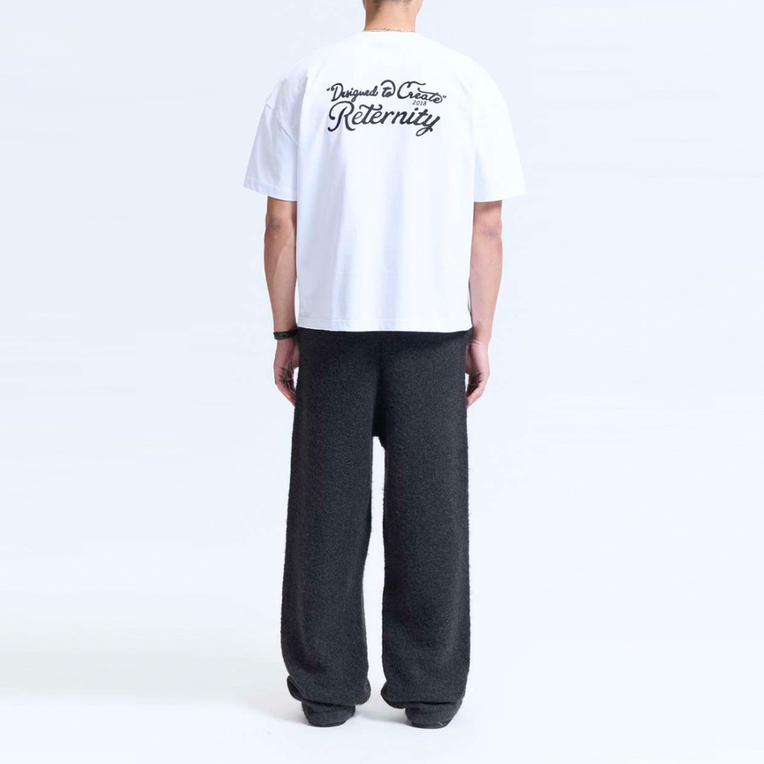 Découvrez le T-shirt RETERNITY - DESIGNED TO CREATE, en pur coton blanc 295GSM. Détails uniques avec broderie 2D sur le devant et cordon de serrage dans le dos. Coupe ample et décolletée pour un style moderne et polyvalent, parfait pour exprimer votre personnalité avec confort et originalité.