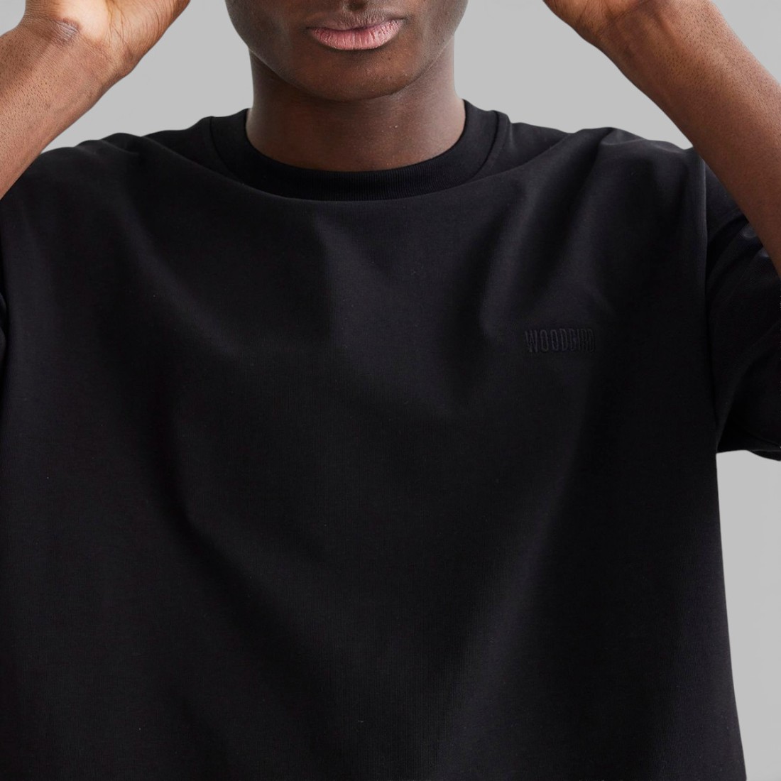 Découvrez le t-shirt Woodbird de WBBaine, en 100 % coton biologique noir. Avec des épaules tombantes, un col ras du cou épuré et des manches courtes, il présente une coupe droite et une silhouette légèrement caissonnée. Essentiel et polyvalent, il conserve le même style devant et derrière, incarnant l'essence d'un T-shirt simple mais de qualité.