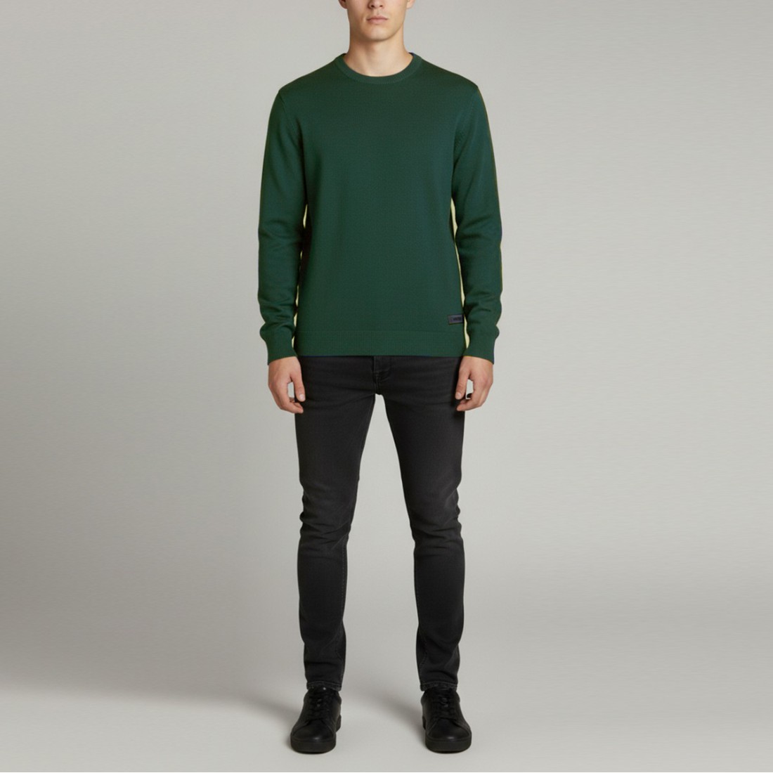 Pull RICHMOND X à col ras du cou en viscose et nylon vert forêt, avec patch logo caoutchouté sur le bord inférieur. Coupe régulière et ourlets élastiqués, il allie confort et style pour un look contemporain et raffiné, parfait pour toutes les occasions.