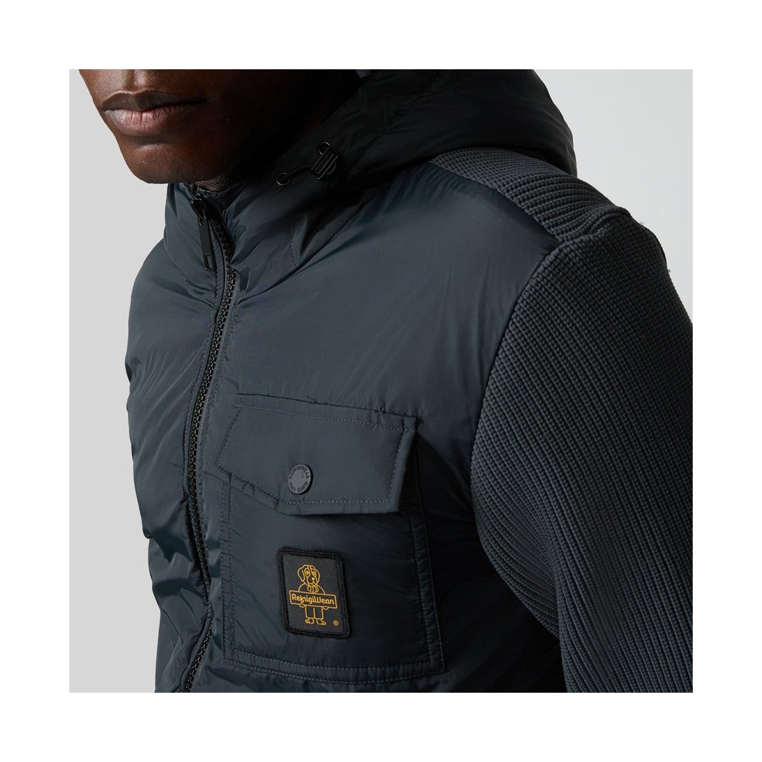 Doudoune d'hiver hybride au look moderne et raffiné. Le devant et la capuche, en nylon opaque à la texture douce et veloutée, sont rembourrés de duvet 90/10 certifié RDS avec une membrane Reclosed® qui réduit la perte de plumes et assure la durabilité. Le dos et les manches en tricot super-technique assurent confort, durabilité et ajustement. Résistant à l'eau et au vent, il est doté d'une poche emblématique et du logo RefrigiWear®.