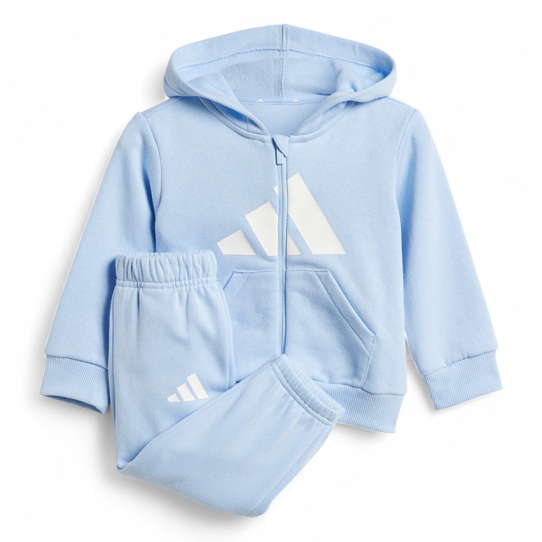 Survêtement Adidas pour bébé en maille douce, en partie en polyester recyclé. Coupe droite pour une grande liberté de mouvement, fermeture à glissière pour faciliter l'habillage et capuche avec cordon de serrage pour une protection supplémentaire. Poignets et ourlets élastiqués, cordon de serrage réglable à la taille et pantalon avec poignets confortables. Poches latérales et intérieur légèrement rembourré pour un confort thermique optimal.