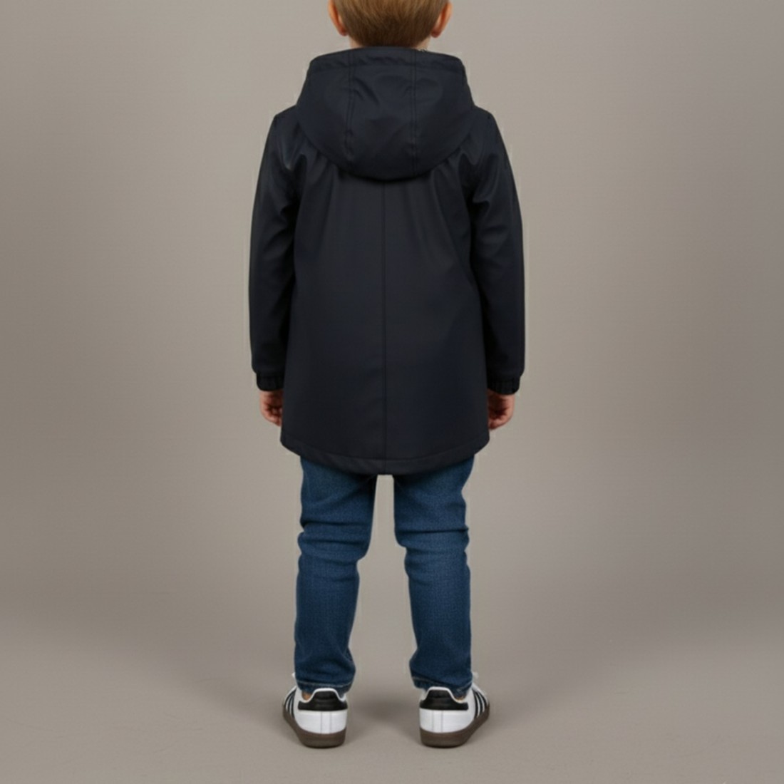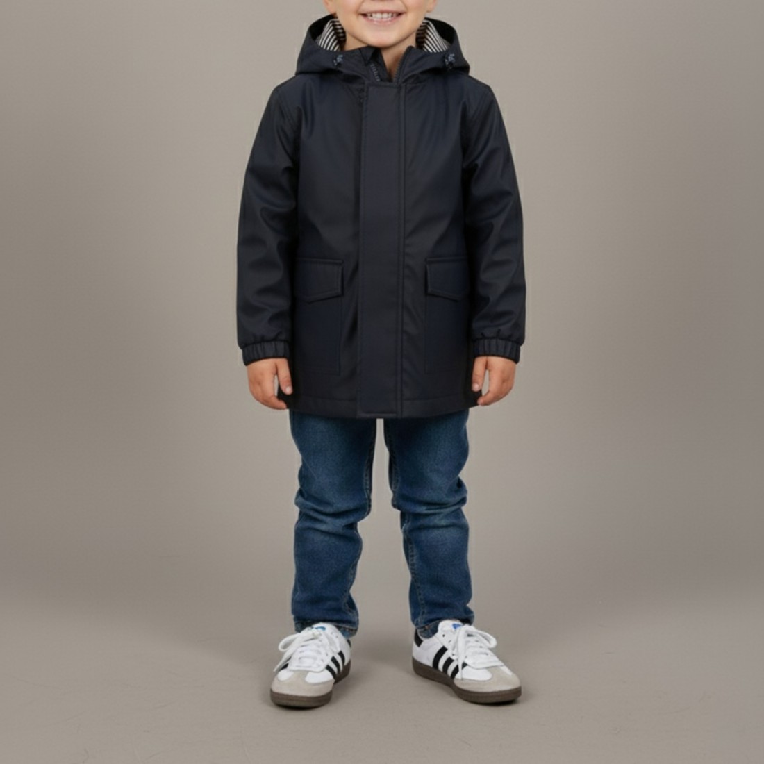 Giacca antipioggia e antivento da bambino BOATILUS in poliestere riciclato blu, leggera e resistente. Dotata di cappuccio con coulisse elasticizzata, chiusura con zip, tasche con patta e polsini elasticizzati. Interno foderato in cotone a righe per garantire comfort e stile nelle giornate di pioggia.