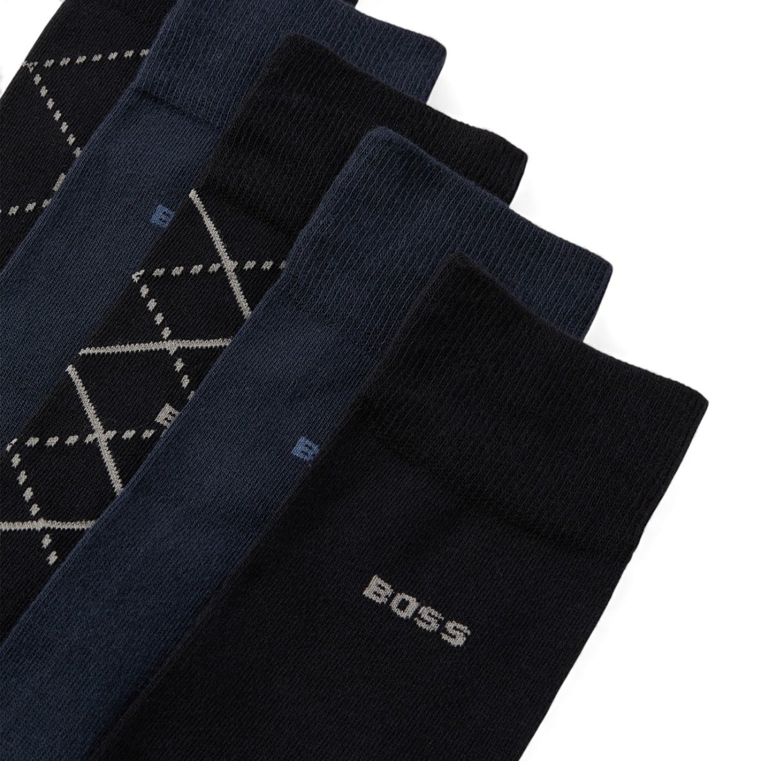 Cinque paia di calze BOSS da uomo a altezza regolare, perfette come idea regalo moderna. Realizzate in morbido tessuto misto elasticizzato per offrire comfort quotidiano, includono modelli in tinta unita e varianti a righe con logo. Punta e tallone rinforzati per una maggiore resistenza e una vestibilità affidabile.Il nostro servizio clienti è a tua disposizione dal Lunedì al Sabato dalle 10:00 alle 19:30.