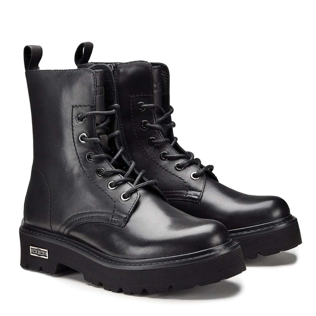 Gli anfibi Slash di Cult, in pelle nera, uniscono stile e resistenza. Con chiusura a stringhe e suola rinforzata da 5 cm, garantiscono comfort e durata, ideali per affrontare ogni stagione con grinta. Perfetti per chi cerca un look deciso senza rinunciare alla praticità.