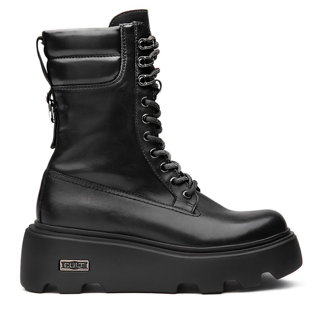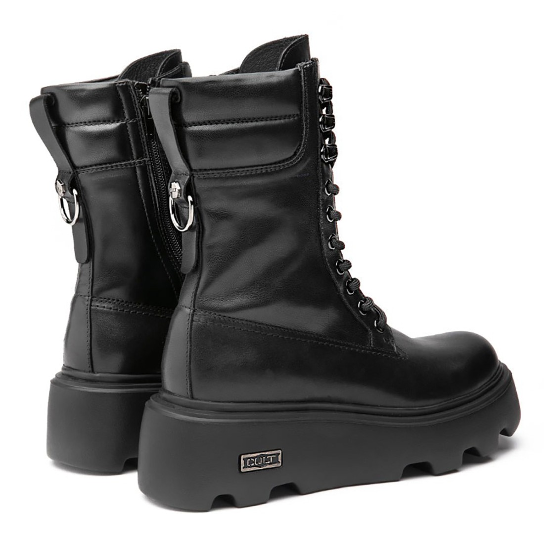 Anfibio mid-calf stringato che unisce pelle e stretch leather per una calzata avvolgente. La silhouette scolpita poggia su un fondo chunky zigrinato, garantendo grip e stabilità. I dettagli metallici e il logo CULT sulla placca laterale aggiungono un tocco glam-rock, per chi vuole distinguersi con stile e personalità.