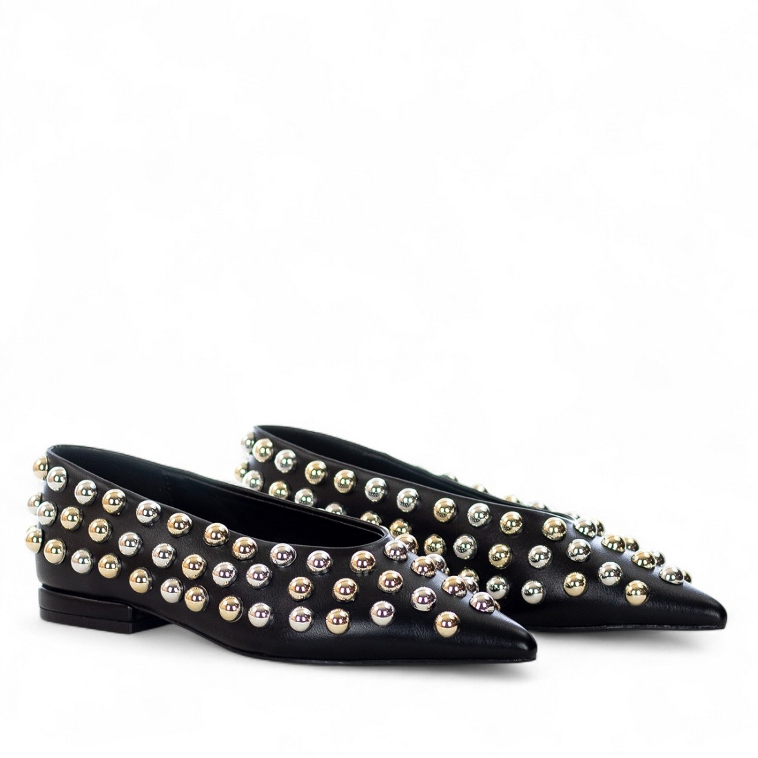 Ballerina EXÉ in ecopelle nera con borchie argento e oro pallido per uno stile elegante e deciso. Dotata di tacco basso da 15 mm e fondo in gomma che assicura comfort e stabilità. Fodera interna in ecopelle e soletta in pelle per una calzata morbida e piacevole. Perfetta per look casual chic e outfit da giorno.