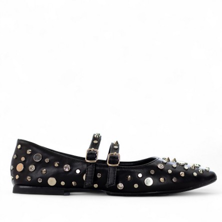 Ballerina EXÉ in ecopelle nera impreziosita da borchie su tutta la superficie e doppio cinturino regolabile con fibbia. Comfort e stabilità grazie al tacco basso da 10 mm e al fondo in gomma. Fodera e suola interna in ecopelle per un tocco elegante e versatile, perfetta per completare ogni look con stile.