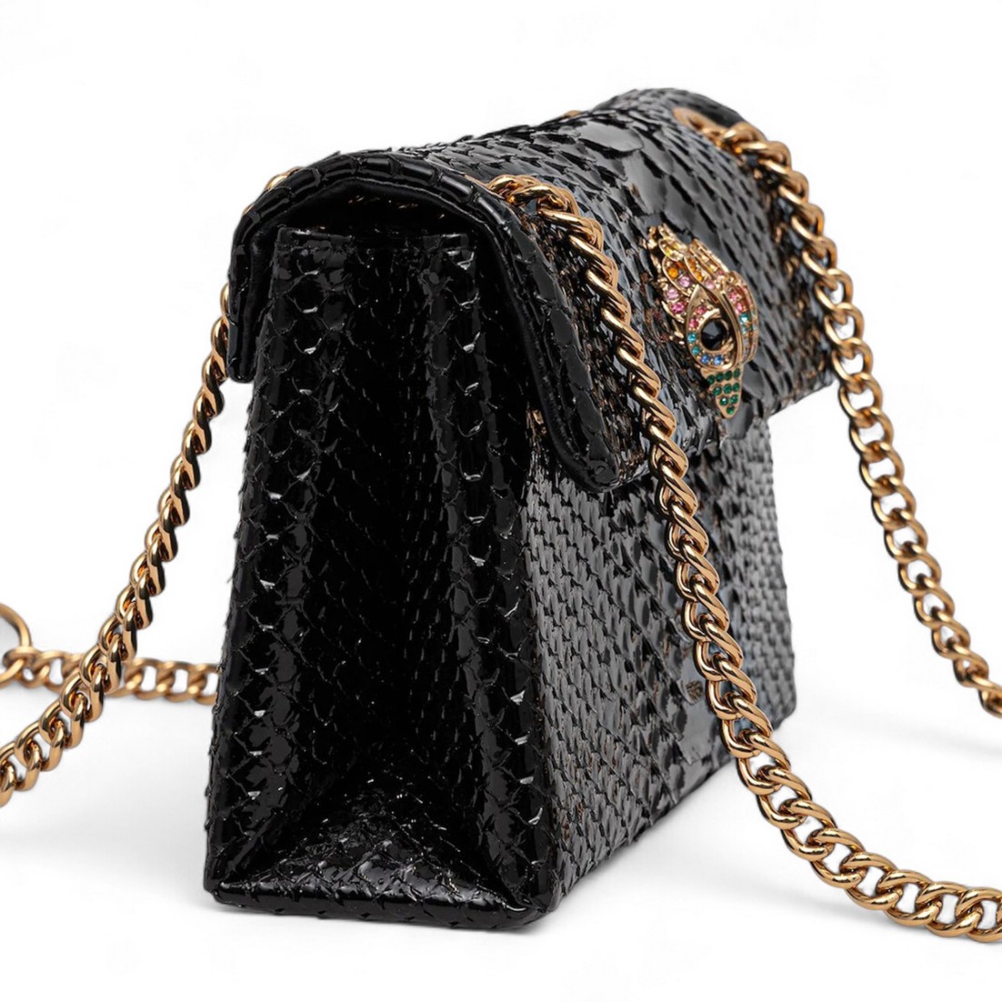 La borsa Medium Jewel Kensington in pelle nera metallizzata 3D è un accessorio di lusso con chiusura a doppio bottone magnetico e tracolla in catena dorata con inserto imbottito. Sul frontale spicca l’iconica testa d’aquila dorata con cristalli e pietre pastello. Misura 15,5x22x7 cm, con interno foderato monogram e tasca, adatta a smartphone fino a 7 pollici. Eleganza e funzionalità in un unico design raffinato.Il nostro servizio clienti è a tua disposizione dal Lunedì al Sabato dalle 10:00 alle 19:30.