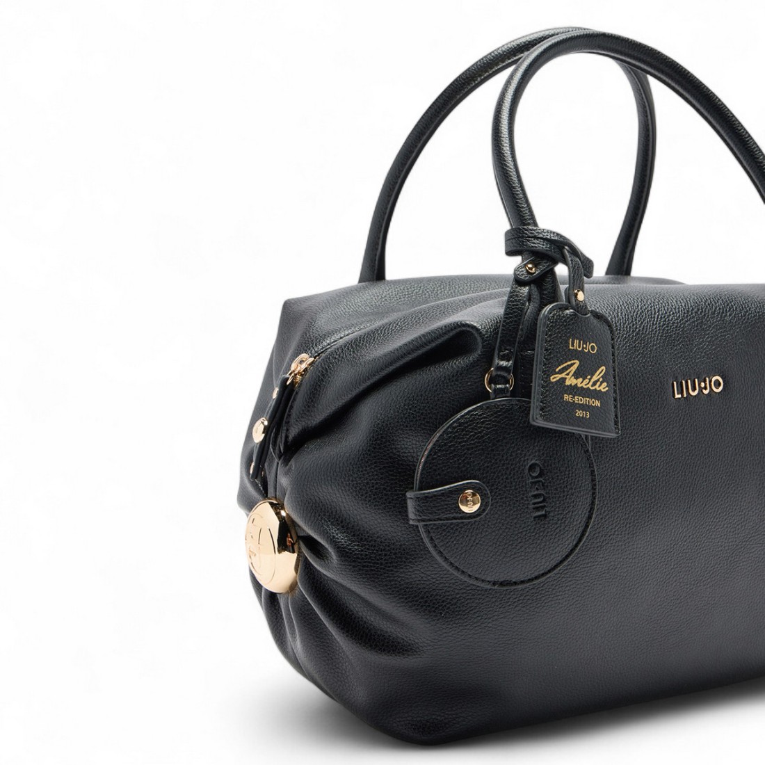 Elegante borsa a mano LIU JO in ecopelle nera effetto bottalato, impreziosita da logo a rilievo e charm decorativo. Dotata di manici comodi, tracolla regolabile e rimovibile, due scomparti con zip e tasca interna. Foderata e curata nei dettagli, presenta piedini metallici e chiusura con bottone magnetico. Misure: 34x15x25 cm. Perfetta per ogni occasione.Il nostro servizio clienti è a tua disposizione dal Lunedì al Sabato dalle 10:00 alle 19:30.