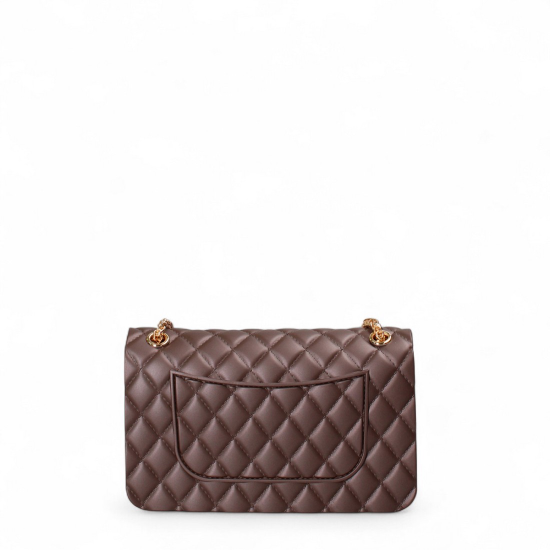 Borsa a tracolla in PVC color cacao effetto matelassé con patta e chiusura a gancio girevole logato. La tracolla in catena e PVC aggiunge un tocco moderno e raffinato, perfetta per ogni occasione. Dimensioni compatte 20x11x6 cm, ideale per completare look chic e contemporanei con stile e praticità.Il nostro servizio clienti è a tua disposizione dal Lunedì al Sabato dalle 10:00 alle 19:30.