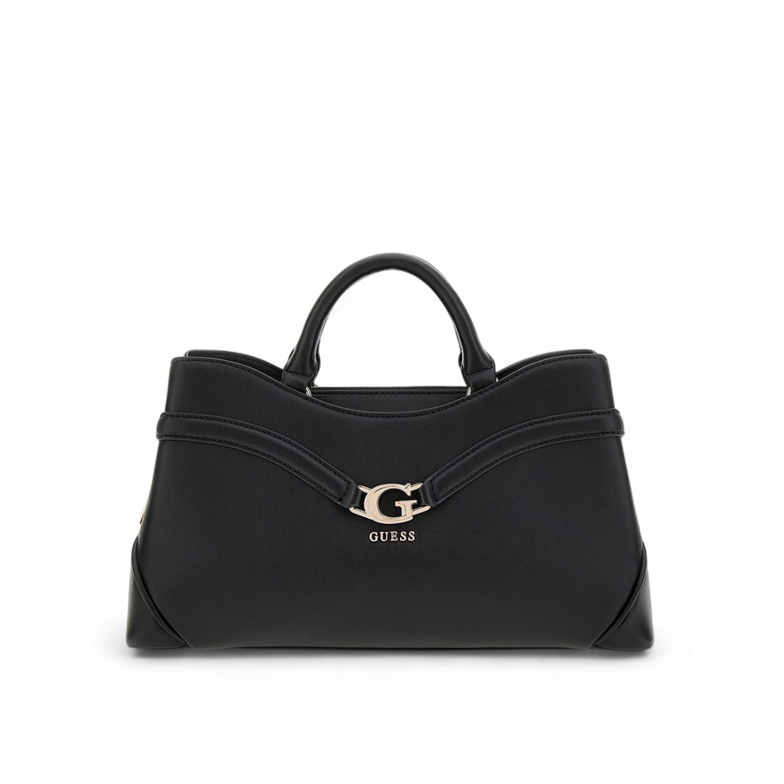 Elegante borsa a mano Guess Dea in similpelle nera, impreziosita da metalleria oro pallido e logo frontale in metallo. Dotata di doppio manico (35 cm) e tracolla regolabile e removibile (110/130 cm), offre praticità e stile. Interno foderato con logo, tasca interna e tasca posteriore con zip. Chiusura con cerniera e doppi bottoni. Dimensioni 34 x 18 x 11 cm. Composizione: 100% poliuretano.