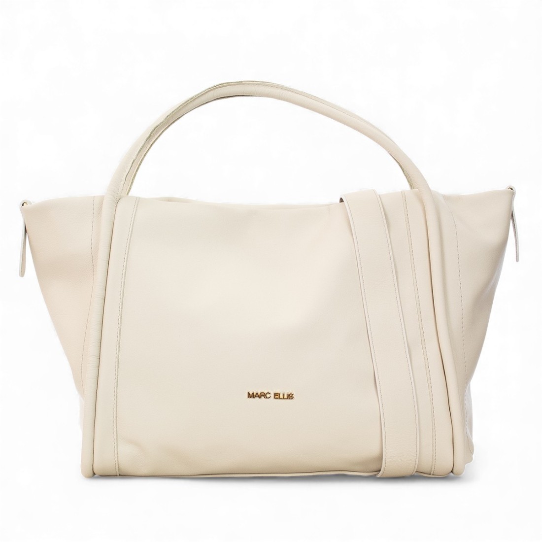 Borsa Marc Ellis in pelle liscia beige con dettagli in oro e logo lettering sul davanti. Dotata di due manici in pelle e un manico a spalla, chiusura con zip. Elegante e versatile, misura 36x28x15 cm.Il nostro servizio clienti è a tua disposizione dal Lunedì al Sabato dalle 10:00 alle 19:30.