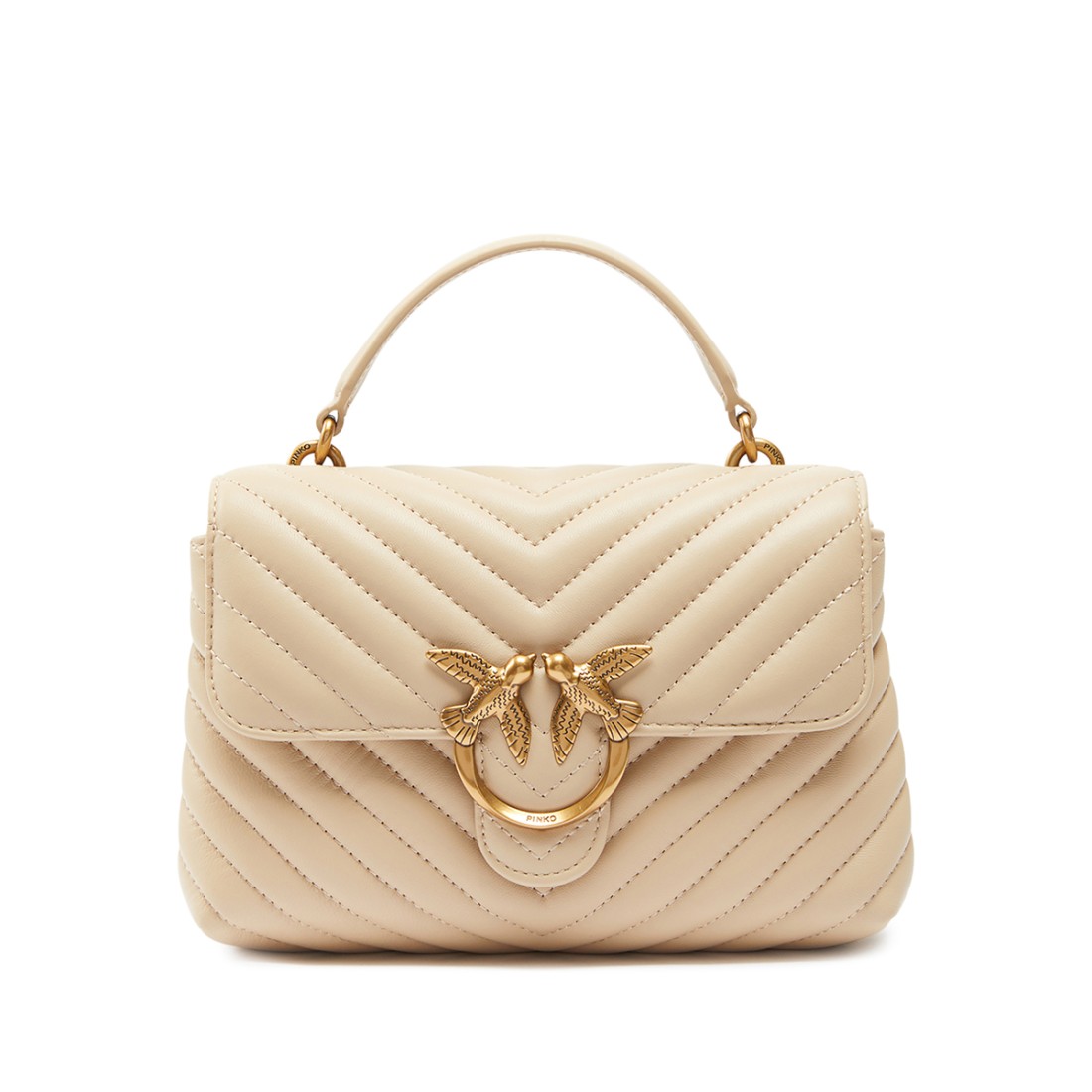 Elegante e compatta, la Pinko Mini Lady Love Bag Puff è realizzata in nappa trapuntata beige con raffinato motivo chevron. La chiusura è impreziosita dall’iconica fibbia Love Birds Diamond Cut in metallo. Interno foderato in microfibra scamosciata con tramezza zip e tasca a parete. Dotata di manico superiore e tracolla con catena e spallaccio regolabile in nappa. Dimensioni: 22 x 15 x 8 cm.