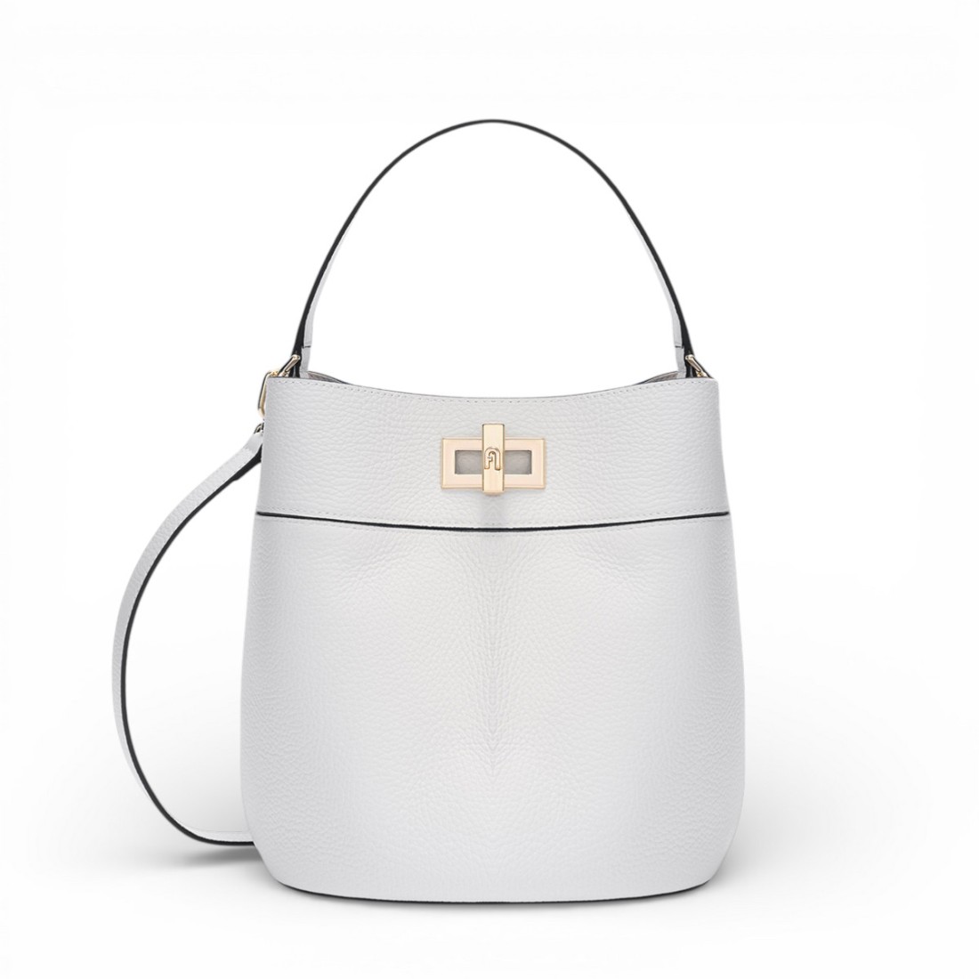 Il secchiello Furla Amelia in pelle di vitello color talco dalla delicata texture granata unisce eleganza e praticità in un design versatile e contemporaneo. Compatto ma capiente, è organizzato con due scomparti: uno frontale con chiusura a girello e uno posteriore con chiusura magnetica, perfetti per custodire gli essentials. Completo di manico, tracolla regolabile e removibile e anello a D per charms e chiavi. Logo Furla punzonato. Dimensioni 22,5 x 24,5 x 18,5 cm.
