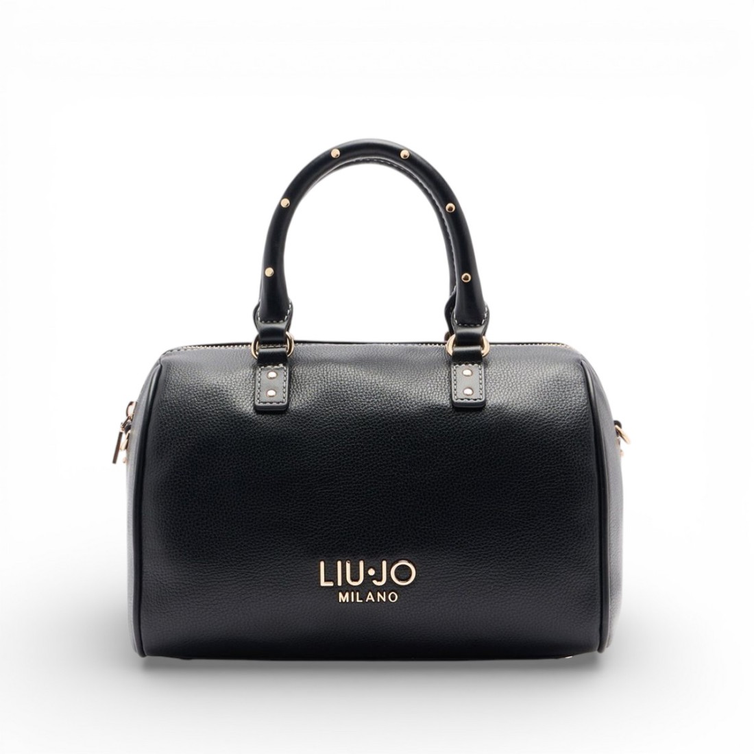 Borsa satchel in ecopelle nera effetto bottalato, compatta ma capiente (25 x 15 x 17 cm). Lo scomparto centrale con chiusura a zip permette di tenere tutto in ordine e al sicuro. Sul davanti spicca il logo lettering in metallo. Dotata di doppi manici in ecopelle con borchie decorative e di una pratica tracolla regolabile e rimovibile, perfetta per portarla a mano o a spalla. Elegante e versatile per ogni giorno.Il nostro servizio clienti è a tua disposizione dal Lunedì al Sabato dalle 10:00 alle 19:30.